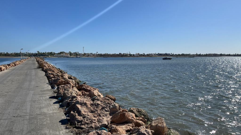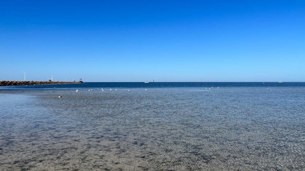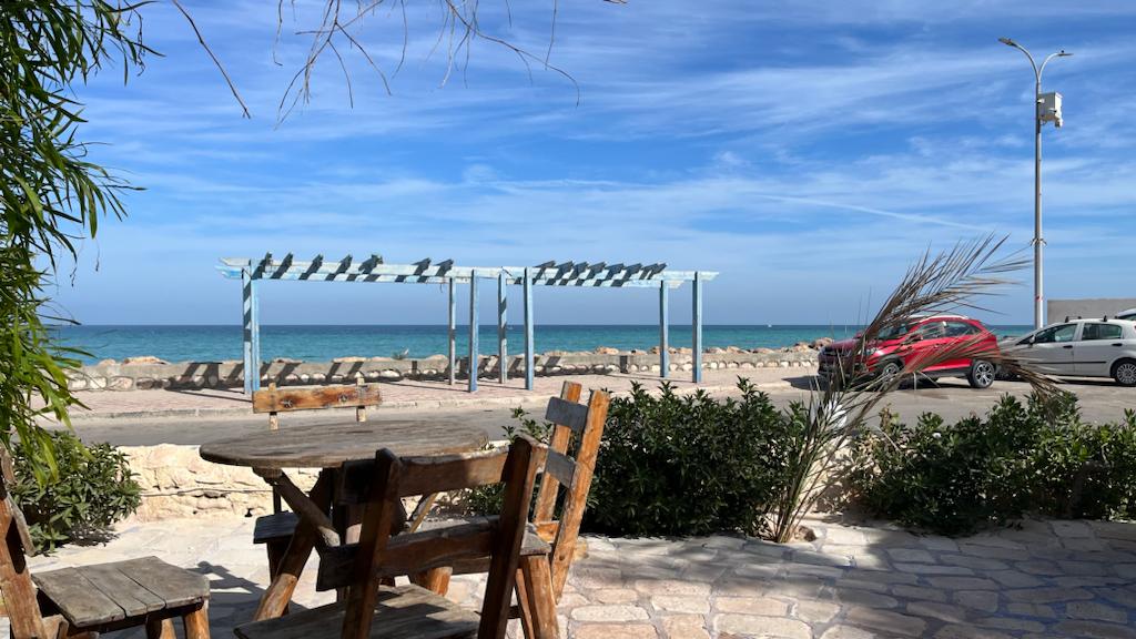 A região das praias é onde ficam concentrados os resorts e os restaurantes mais caros. Em El Jazira, a praia onde estávamos, havia um restaurante na beira do mar cujos pratos estavam com preço médio um pouco acima do que visto no centro da cidade. E é menos bem servido, mas mesmo assim dividimos um prato de peixe (21,50 dinares/R$ 35). Por ser baixa temporada, havia poucos turistas, mas vimos estrangeiros caminhando pela praia.