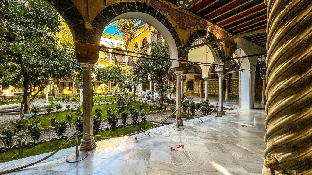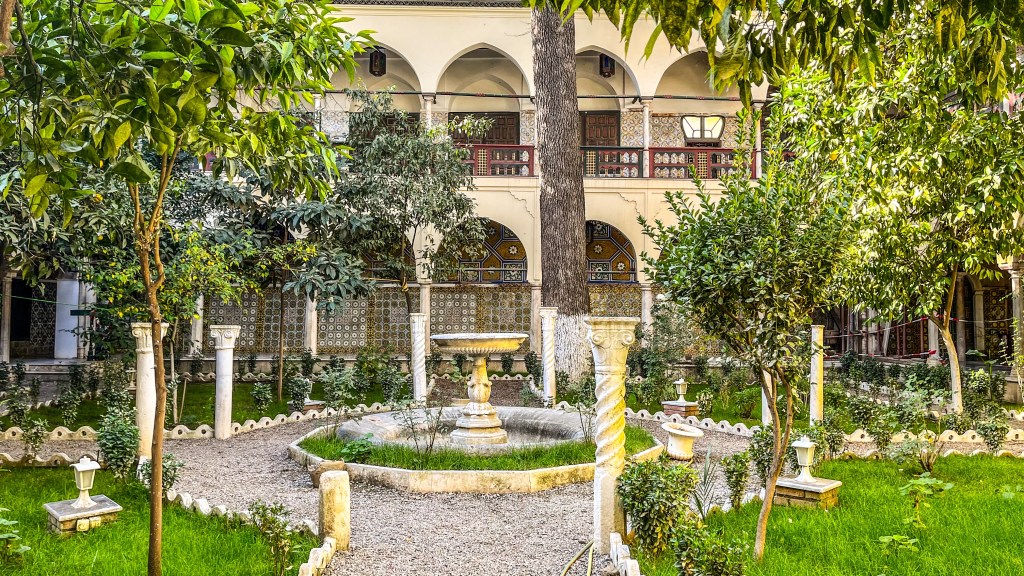 No dia seguinte, voltamos ao Palácio Ahmed Bey, a cinco minutos do hotel, e descobrimos que a porta que havíamos tentado antes era a dos fundos, enquanto a entrada principal era grande, com letreiro e tudo. O guia, estagiário, nos mostrou os quartos e corredores, e nos explicou que os azulejos foram importados de vários países e os murais eram representações por onde o importante advogado e administrador tinha passado em sua viagem de 15 meses pelo Oriente Médio.