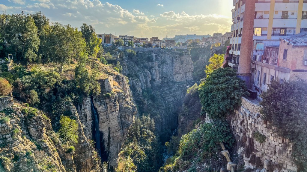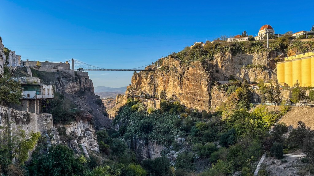 Após duas horas de estrada, chegamos ao terceiro maior município argelino, também conhecido como a cidade das pontes. E logo descobrimos o porquê da alcunha: as estruturas ligam duas grandes formações rochosas, onde os habitantes construíram suas casas. Assim, é necessário passar pelas pontes para transpor o vale.