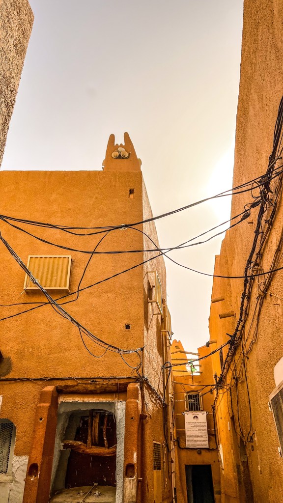 Tínhamos pesquisado que em Ghardaia há um albergue da juventude e, assim que chegamos à rodoviária da cidade, partimos para lá. Infelizmente não havia mais vagas, o que gerou um debate acalorado entre o casal para saber os próximos passos. Após recobrarmos as energias com café e pain au chocolat, avaliamos que o melhor era andar 4 km até o centro da cidade, onde encontraríamos opções de hospedagem.
