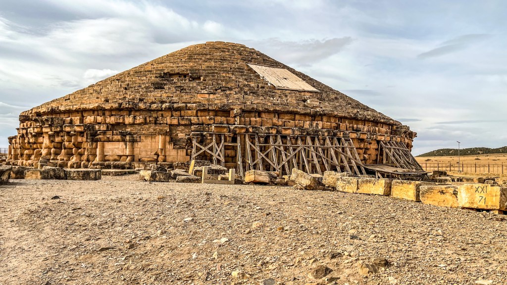 Após o almoço, pegamos mais um tanto de estrada até o mausoléu do rei berbere Numida Medghcen, uma enorme construção de pedras que lembra uma oca brasileira. Infelizmente, é proibido entrar na estrutura porque já tiveram alguns desmoronamentos internos.