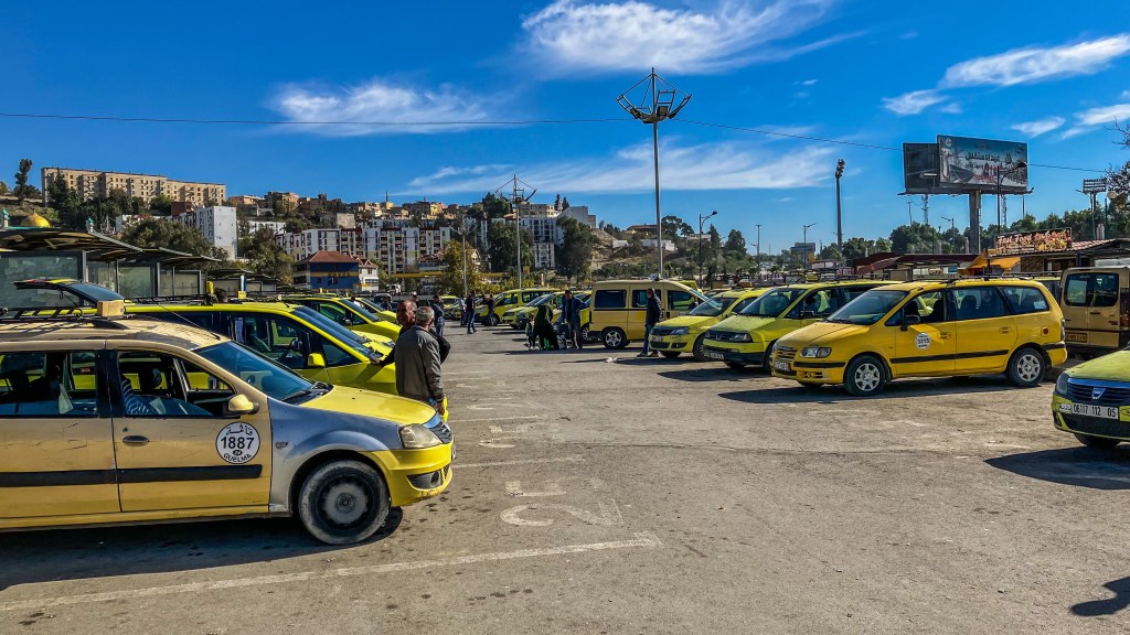 Para sair de Annaba, o recepcionista do hotel nos indicou pegar um táxi coletivo. Estávamos reticentes após nossa má experiência na fronteira, mas ele afirmou que os ônibus na região não são bons. Até tentamos descobrir informações sobre trens, mas o funcionário da estação não soube se comunicar em francês.