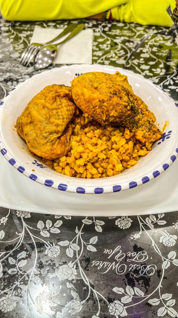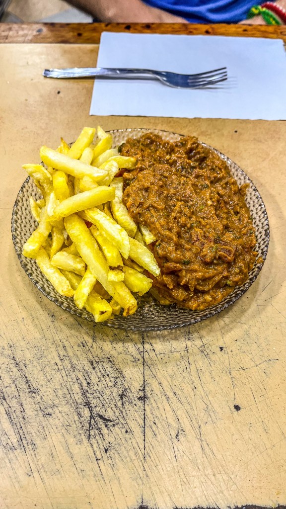 De noite, após descansar e tentar aproveitar a internet instável, partimos em busca do jantar. A região estava deserta e só encontramos lanchonetes pequenas, de bairro. Os atendentes não falavam francês, então apelamos para a tradicional mímica, e até teve garfo para provar a comida, que era muito boa, por sinal.