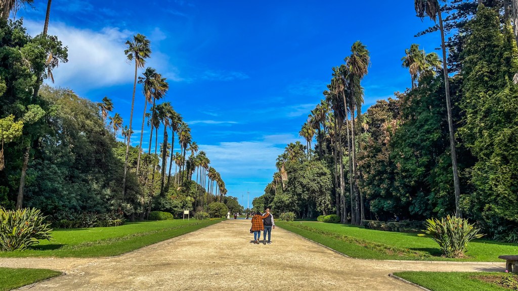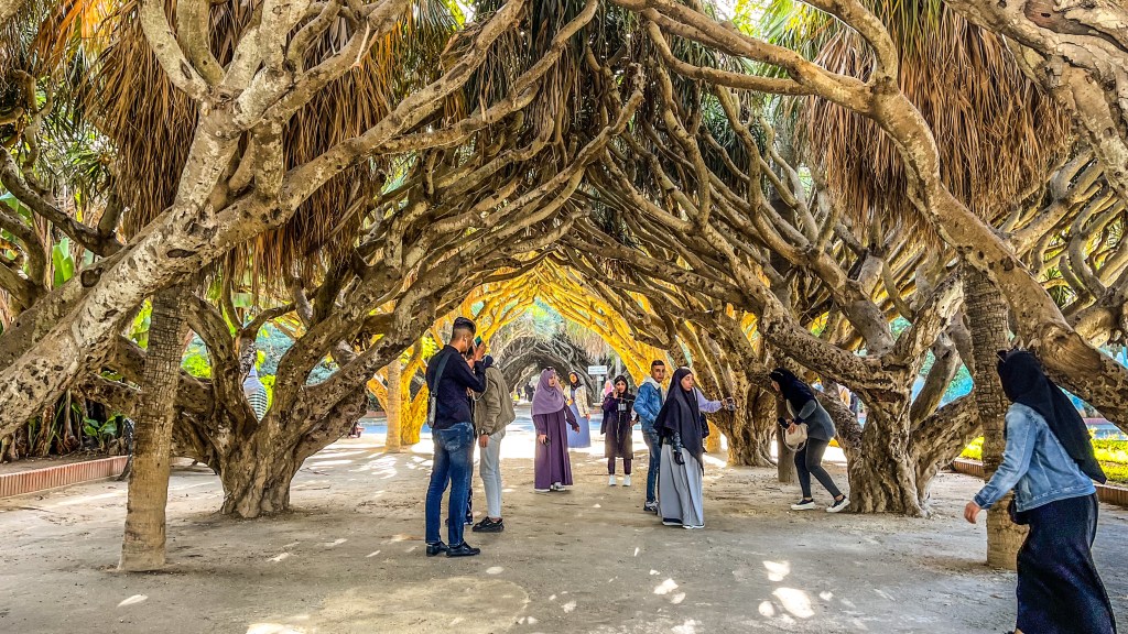 De volta ao passeio, do monumento é possível pegar um bondinho a 20 dinares argelinos (R$ 0,85) para o Jardim Botânico Hamma (descobrimos isso só quando chegamos lá embaixo). A entrada é paga e custa 150 dinares argelinos (R$ 6,40), mas é um passeio agradável de se fazer. Há mesas para piqueniques e diversos bancos espalhados sob as árvores.
