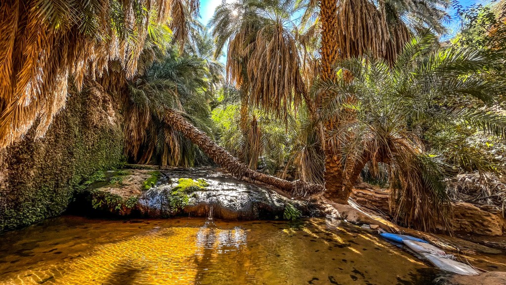 Tivemos a sorte de ter o oásis só para nós, e realmente é uma delícia passar algumas horas por lá. A água é quente e estar em meio às palmeiras enquanto “lá fora” faz um calor desgraçado é extremamente agradável.
