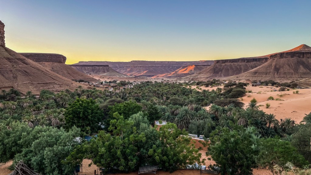 Por ter muito deserto, a Mauritânia tem também os famosos oásis. Um deles fica em Terjit, a cerca de 400 km da capital. Para chegar lá, é preciso pegar uma das vans que saem do norte da capital, ao custo de 500 ouguiya (R$ 73) por pessoa. Mas quem arranjou nosso transporte do hostel até o local de partida da van e também entre Nouakchott e Terjit foi o próprio dono do albergue, Menne.