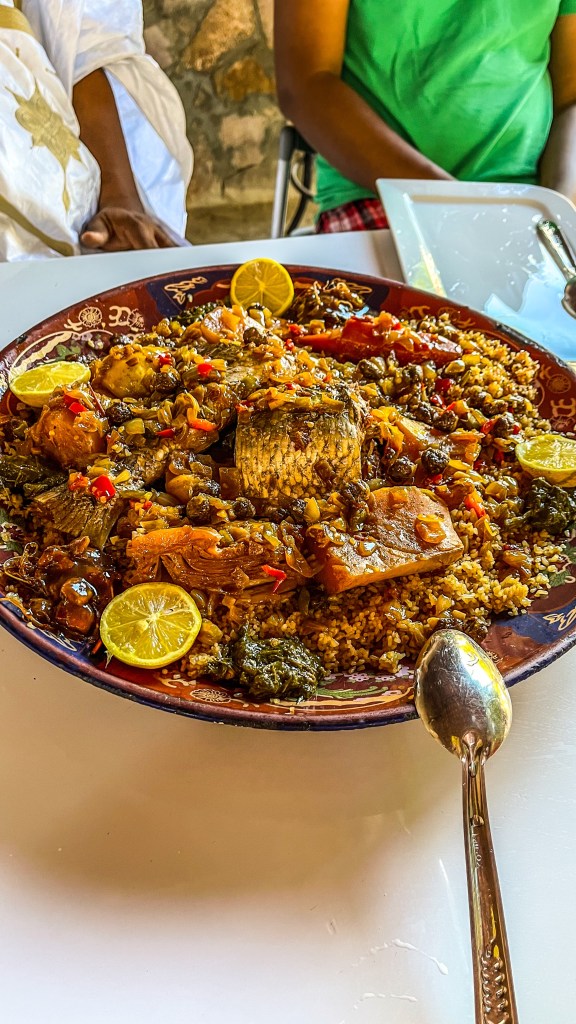 Sid Ahmed, por sua vez, fez o mesmo. Compartilhamos chás e refeições, além de ter reservado nossa volta para Nouakchott e avisado Menne para que alguém fosse nos buscar no ponto de chegada da van. De volta ao Africa Escale, fomos recebidos com um almoço típico, um arroz com verduras e peixe. Também aproveitamos para reservar com o taxista amigo de Menne nosso deslocamento até a van para a fronteira com o Senegal.