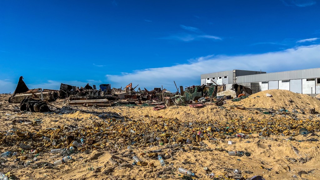 Pegamos um táxi (300 ouguiya/R$ 46,50 para os quatro) até Cansado, a 10 km do centro de Noaudhibou, e de lá caminhamos pela orla. Após uns 2 km é que encontramos o primeiro barco abandonado. Assim como lixo, muito lixo na areia —garrafa d’água, luva de plástico e sacolas, entre outros tantos itens. ONGs que limpam praias teriam que usar alguns caminhões para dar conta do recado.
