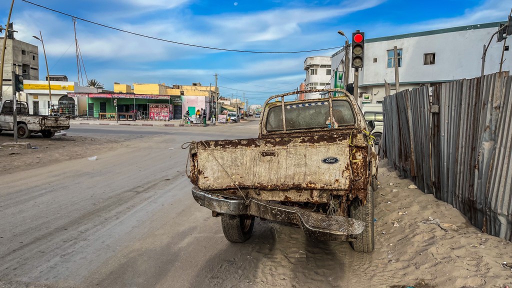 De volta ao hotel, tiramos o dia para nos recuperar dos 10 km de caminhada e também porque não há muito o que ver ou fazer em Noaudhibou. A segunda maior cidade tem uma forte presença de estrangeiros, principalmente de chineses, como se vê nas fachadas em mandarim de lojas e restaurantes. Nas ruas, muitos carros caindo aos pedaços dividem espaço com SUVs novinhas em folha.