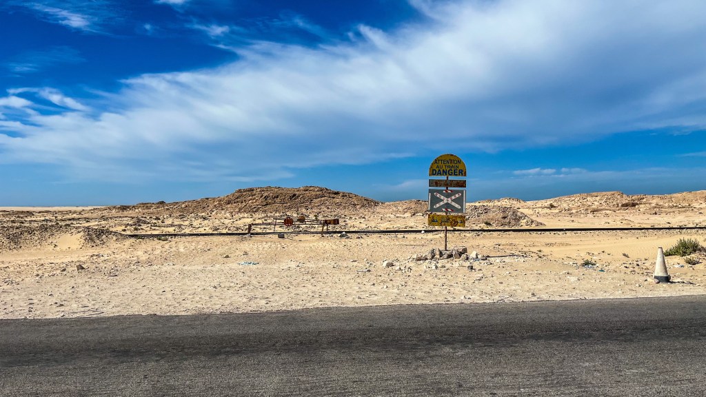 Quando caminhar pela orla ficou impossível, já que muitos trechos eram fechados por muros de empresas, passamos a andar na estrada. E tivemos contato com outra atração mauritana que empolga muitos mochileiros e aventureiros: o trem de minério de ferro, um dos maiores do mundo.