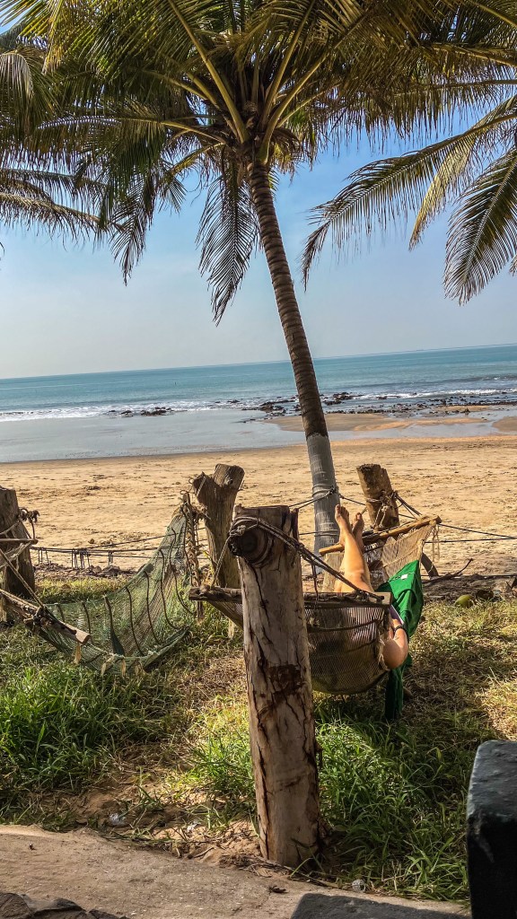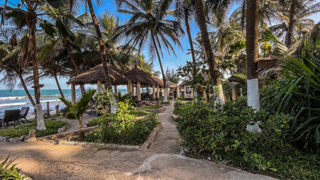 No entanto, o que realmente nos motivou é a localização: a hospedagem fica na beira do mar. Há várias mesas cobertas com telhado de palha, além de redes, que nos fazia passar o dia contemplando o oceano Atlântico. Também há ali um restaurante, com preços mais acessíveis —os pratos saem a 400 dalasi (R$ 36).