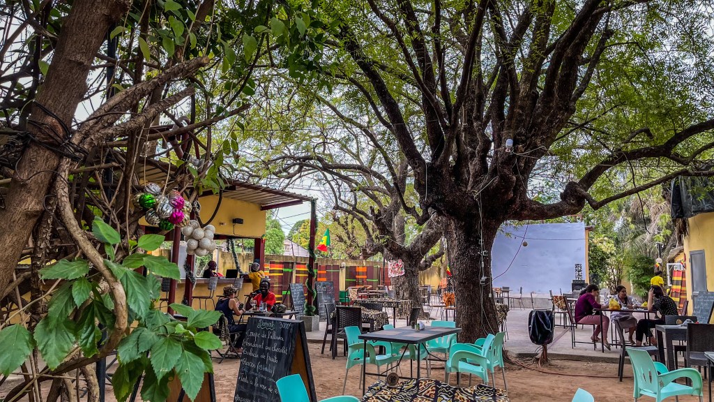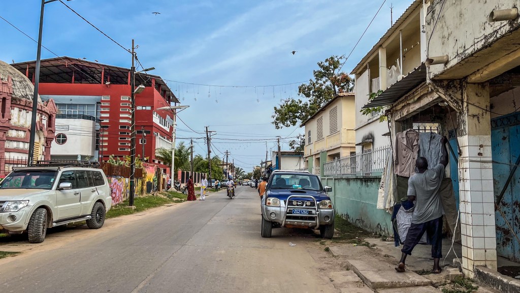 Encontramos o hotel Casafrique, que não consta nos aplicativos de hospedagem, apesar de sua boa qualidade. Por 17.000 XOF (R$ 151), tínhamos, além do quarto amplo, um banheiro privativo, café da manhã farto e uma grande área verde comum —três itens que o primeiro endereço não possuía. Outra vantagem do endereço é ser bem próximo ao consulado da Guiné-Bissau, onde tiramos rapidamente nosso visto.