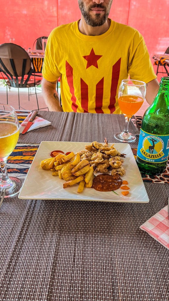 O Google Maps mostra vários restaurantes e cafés, mas nem todos estão funcionando. Adotamos o barato restaurante La Marmite como principal fonte de alimentação. O menu é de uma opção diária, com pratos tradicionais e fartos a 1.500 XOF (R$ 13).