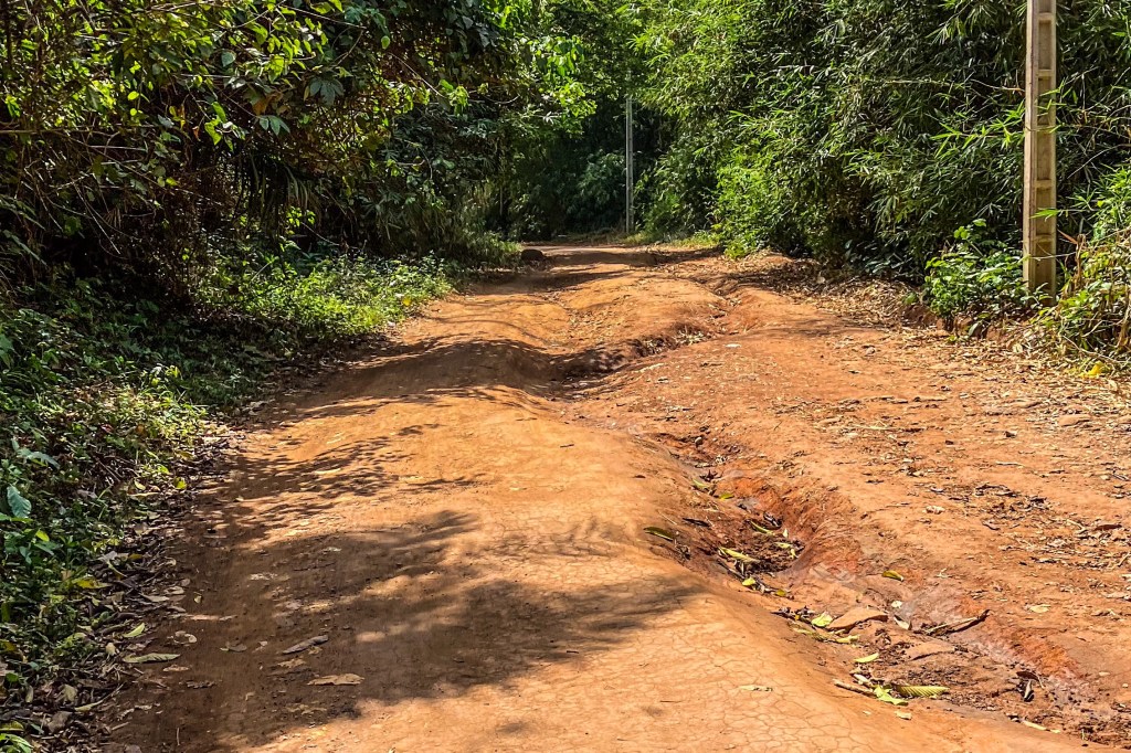 Grande parte do trajeto fizemos em vias asfaltadas, mas o último 1 km do trecho era numa estradinha de terra morro acima, em meio à floresta. Entretanto, ela era larga o suficiente para táxis transitarem. Imaginamos que os carros eram contratados exclusivamente para esse percurso, enquanto tentávamos com táxis compartilhados.