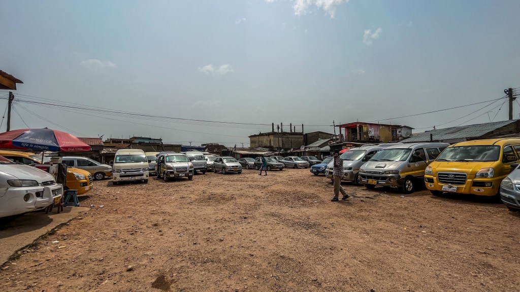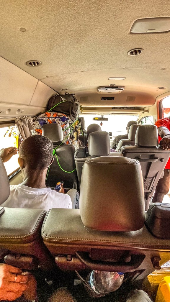 Como era início da tarde, optamos por van mesmo, para chegar no mesmo dia. E nosso veículo não deixava muito a desejar se compararmos com um ônibus, já que tinha ar-condicionado e até carregador USB. Pagamos 165 cedis (R$ 73,50) por assento e outros 10 cedis (R$ 4,50) por mochila.