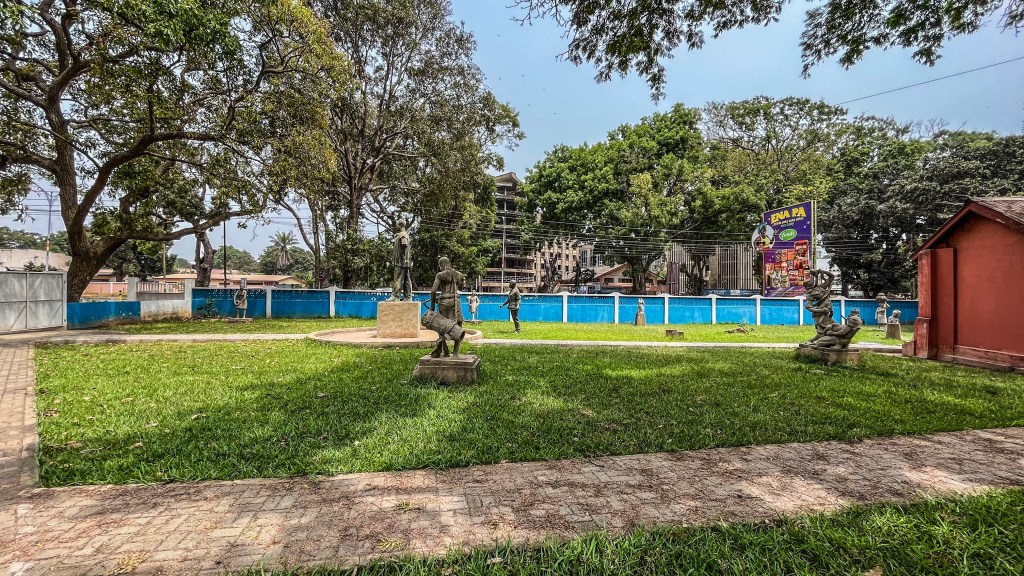 Mas antes de entrarmos nessa visita, ali perto fica o Adomdwee Park, construído em homenagem a John Evans Fifi Atta Mills, presidente de Gana entre 2009 e 2012. Há um belo jardim, uma enorme bandeira do país e o túmulo onde a população vai prestar homenagem ao falecido ex-mandatário.