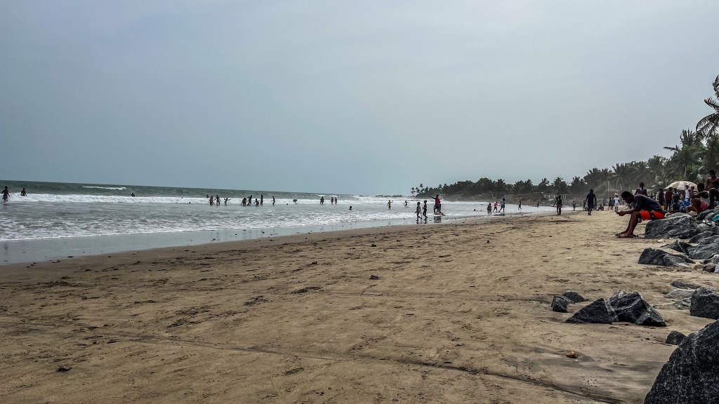 Isso quer dizer que não aproveitamos uma praia em Gana? Longe disso! O país tem 550 km de costa, então em algum ponto daria para entrar na água. Escolhemos Kokrobite, a cerca de 30 km de Acra, para isso. A indicação foi de um funcionário carioca da embaixada brasileira no país e, por ser da mesma origem que a gente, botamos fé que o gosto seria semelhante.