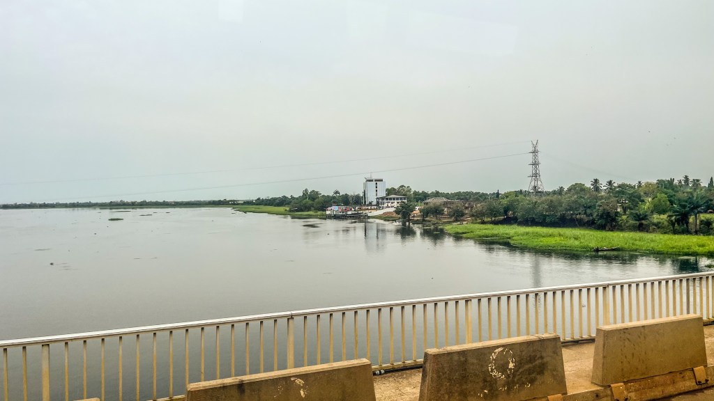 Ao contrário do Brasil, o ônibus não tinha um horário certo de saída, e partimos quando ele ficou cheio. Por sorte, a espera foi de apenas 30 minutos. Outra pequena alegria foi que, desta vez, sentamos naquelas poltronas duplas e não ficamos entre mães com crianças de colo, como aconteceu quando viajamos entre Man e Abidjã, na Costa do Marfim.