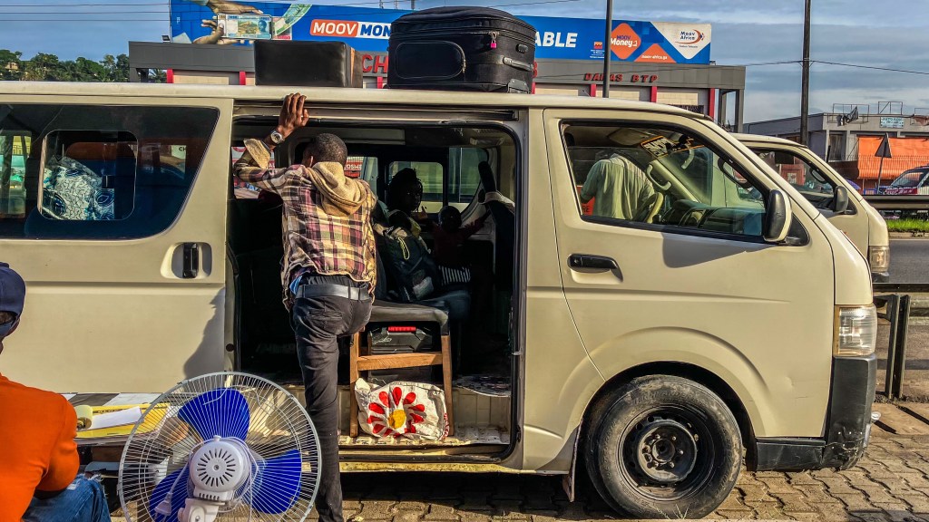 Pegamos uma van no PK8, lugar de onde partem os veículos, e pagamos 18.000 XAF (R$ 157) por pessoa para Bitam, a cidade mais próxima à fronteira com Camarões. Há várias aglomerações de carros, então é preciso ter perseverança para encontrar a que tem o destino desejado.