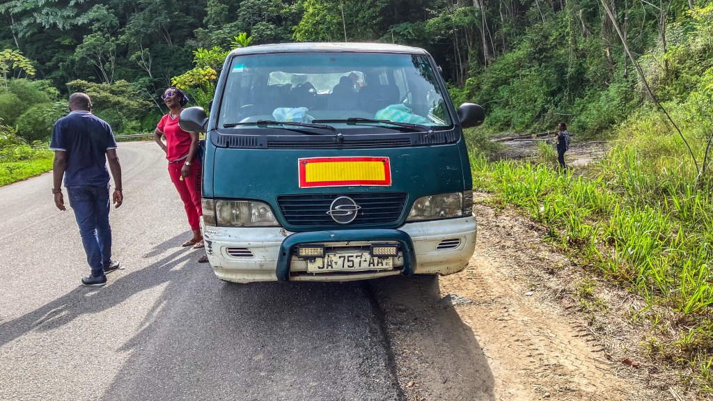 As tortuosas estradas que cruzam o Gabão têm vários buracos, e o motorista parecia não se importar muito com as curvas, dirigindo em alta velocidade. Para incentivá-lo na direção perigosa, a música estava no talo. Também não ajudava o fato de uma passageira reclamar/gritar bastante sobre as atitudes do motorista.