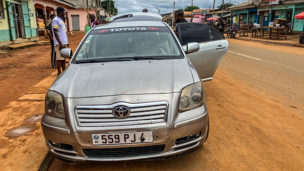 There are some taxis, but no passengers. As it’s 15.000 XAF per person, they asked us 90.000 XAF to complete the car. We didn’t accept this and left (15.000 XAF by person) with the guy from the Cameroon border, and he completed the car in the first city. We left at 9:15 a.m. and arrived at Ouésso at 2 p.m.