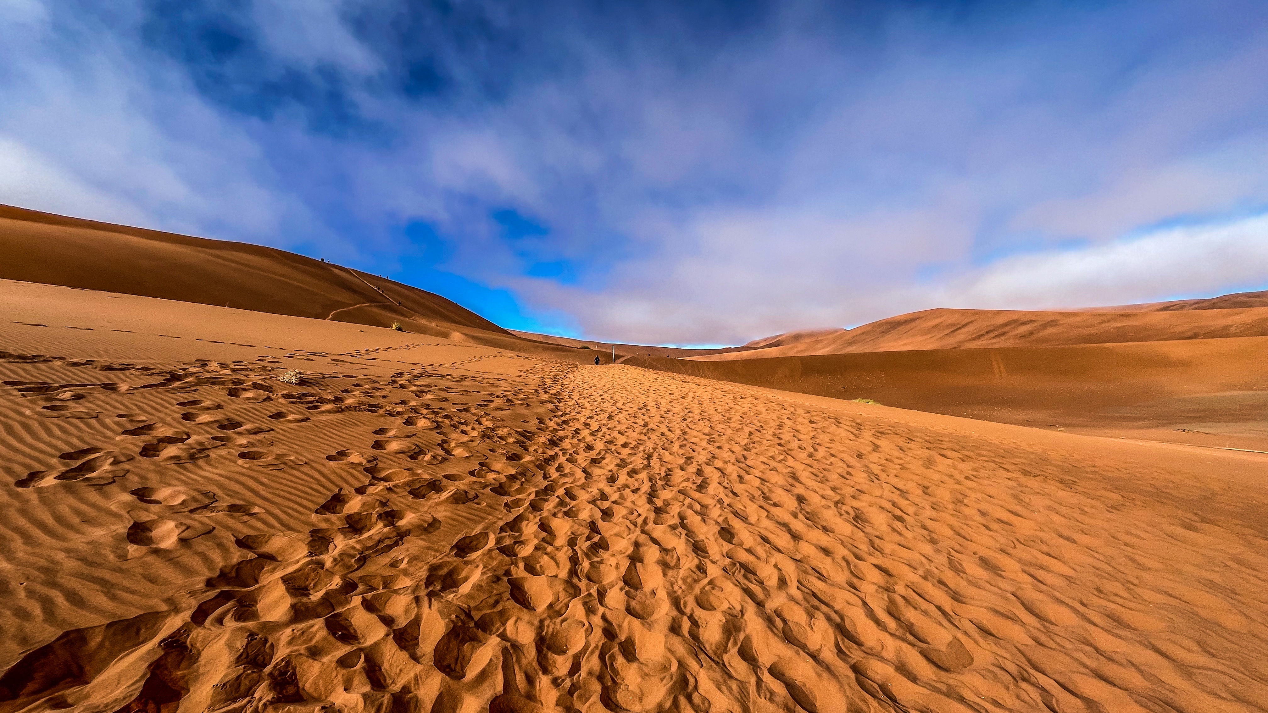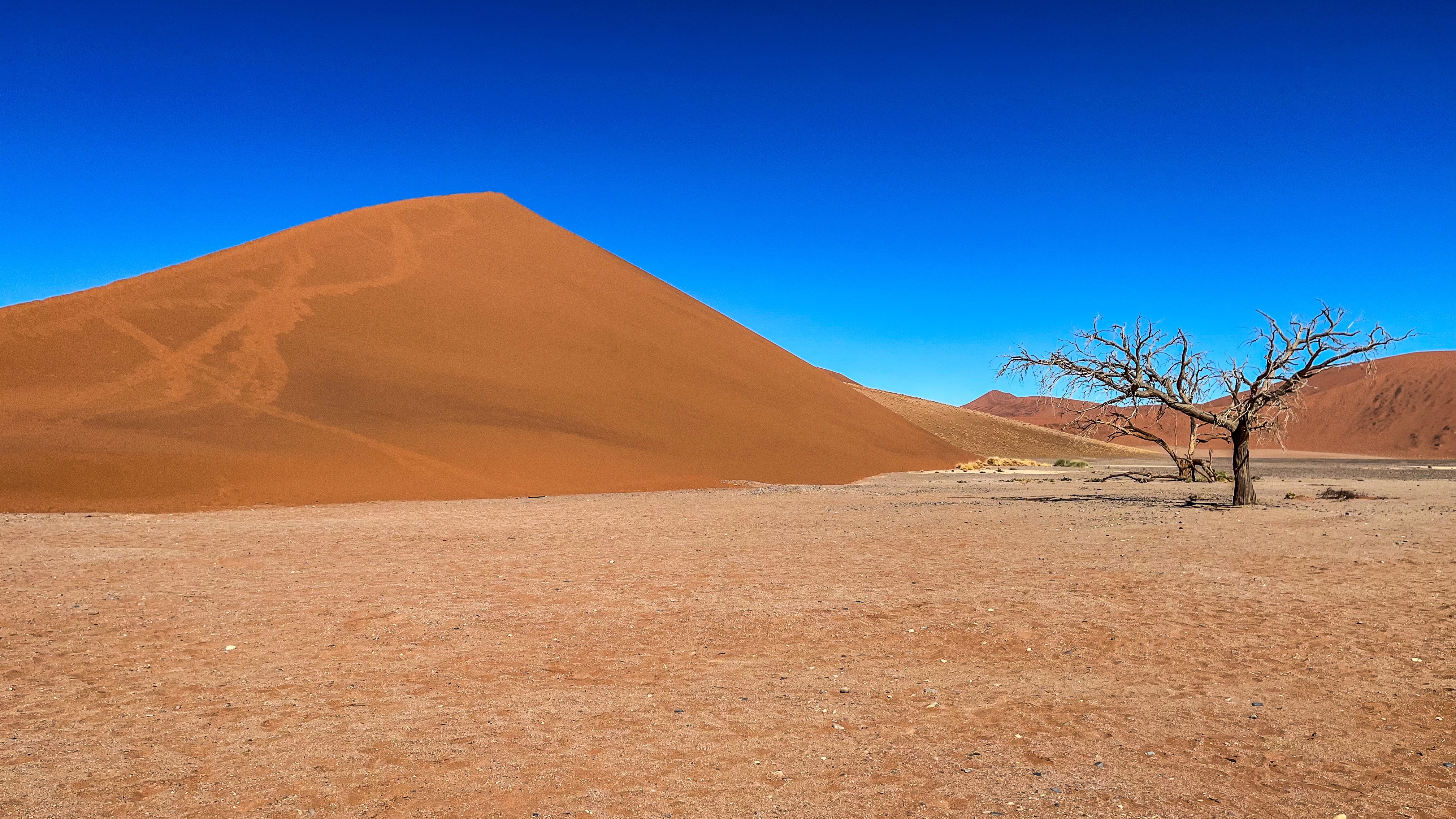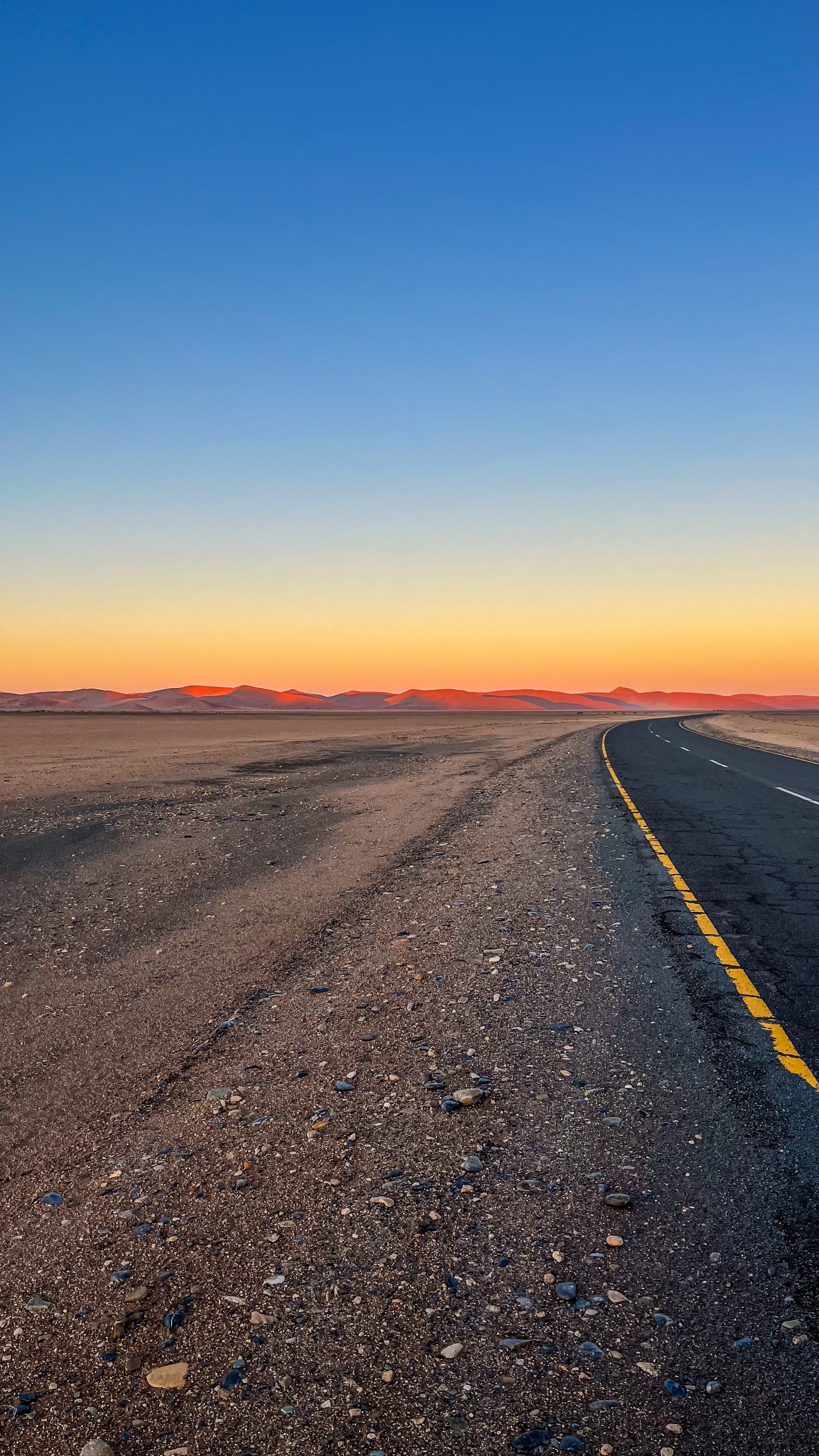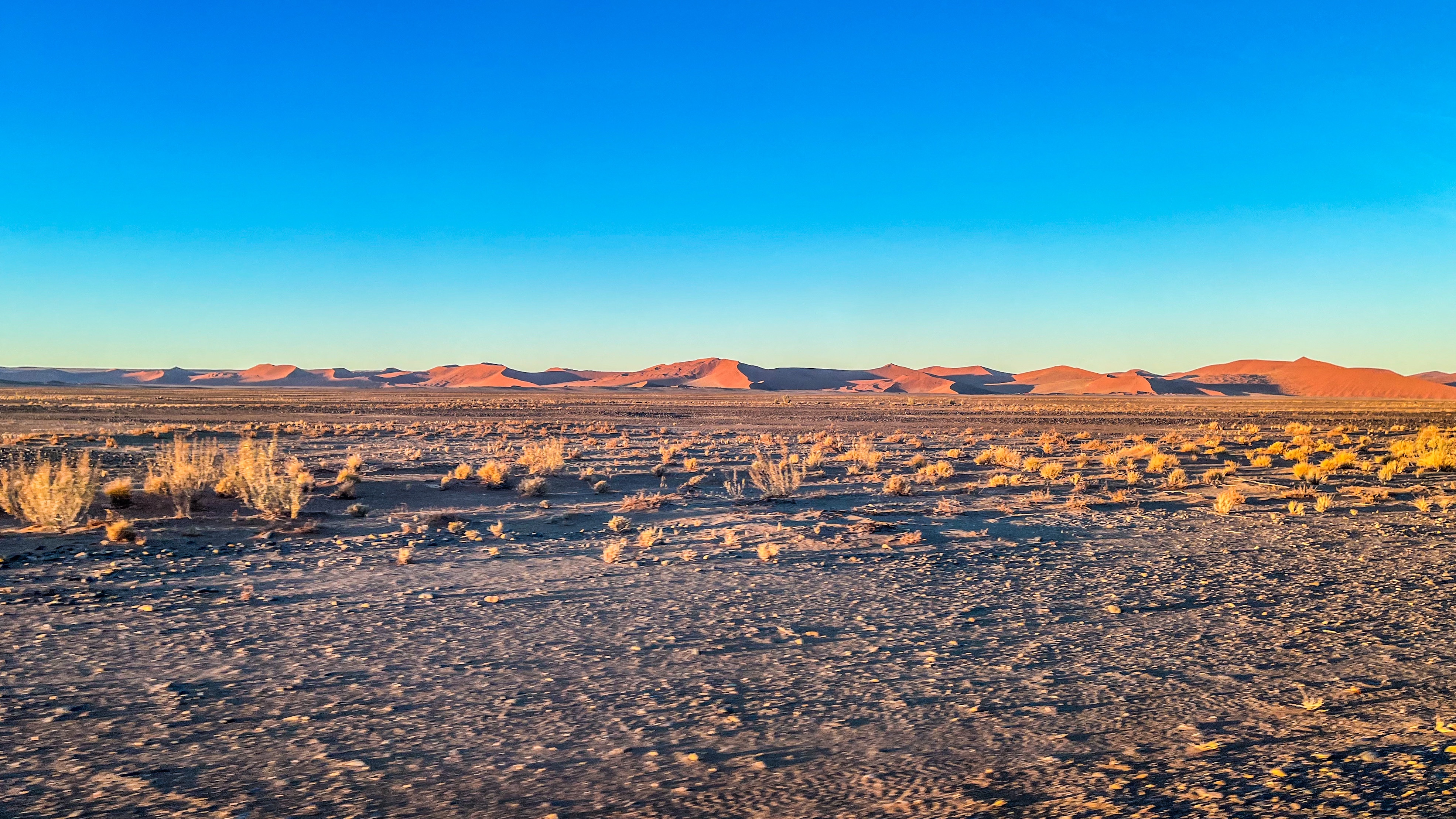 Acordamos cedo para conferir o nascer do sol dentro do Sossusvlei, e o vimos na estrada para as dunas. O parque inclui a Dune 40 e Dune 45 (números em referência à quantidade de minutos que leva para subi-las) e o Deadvlei.