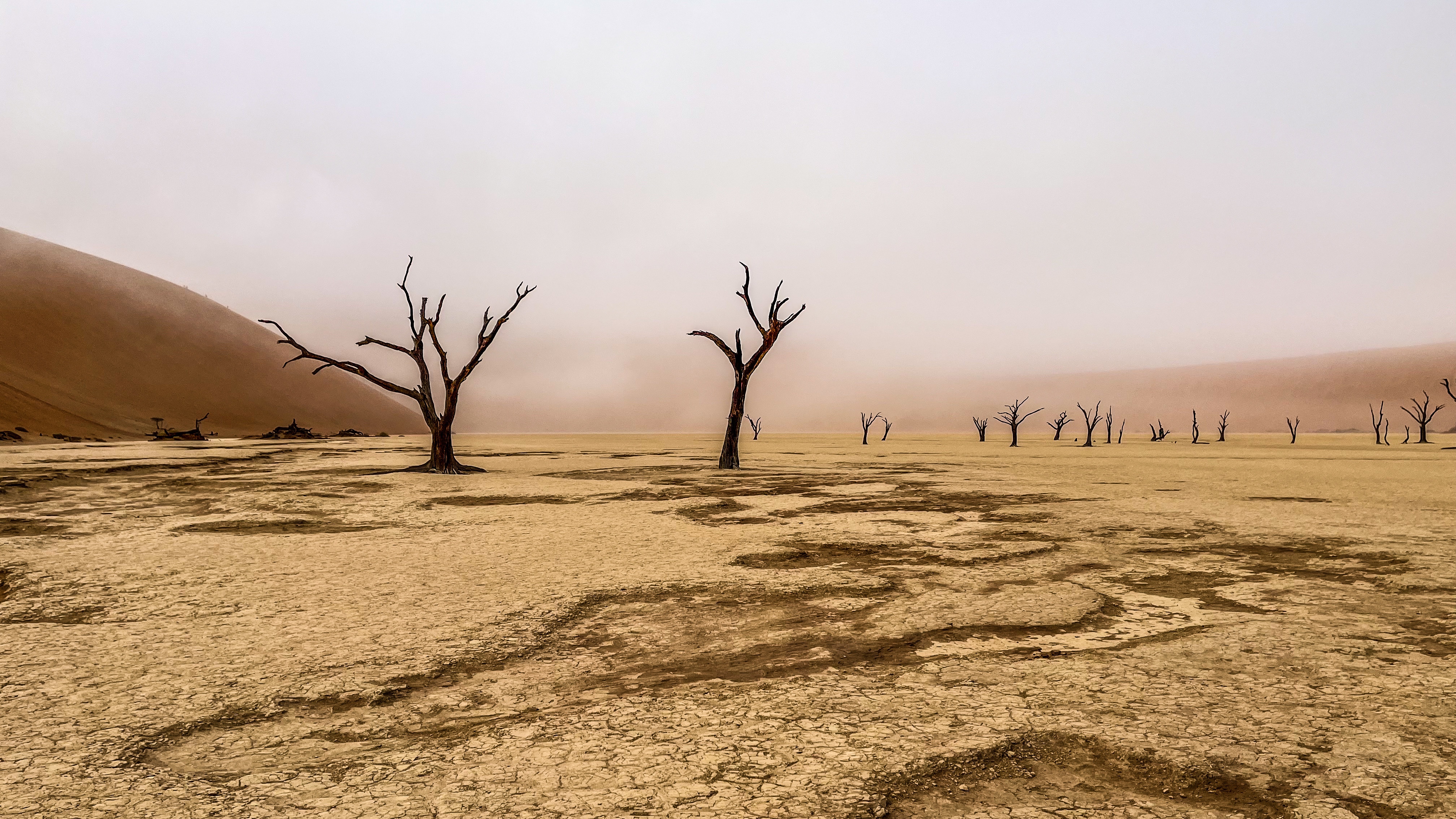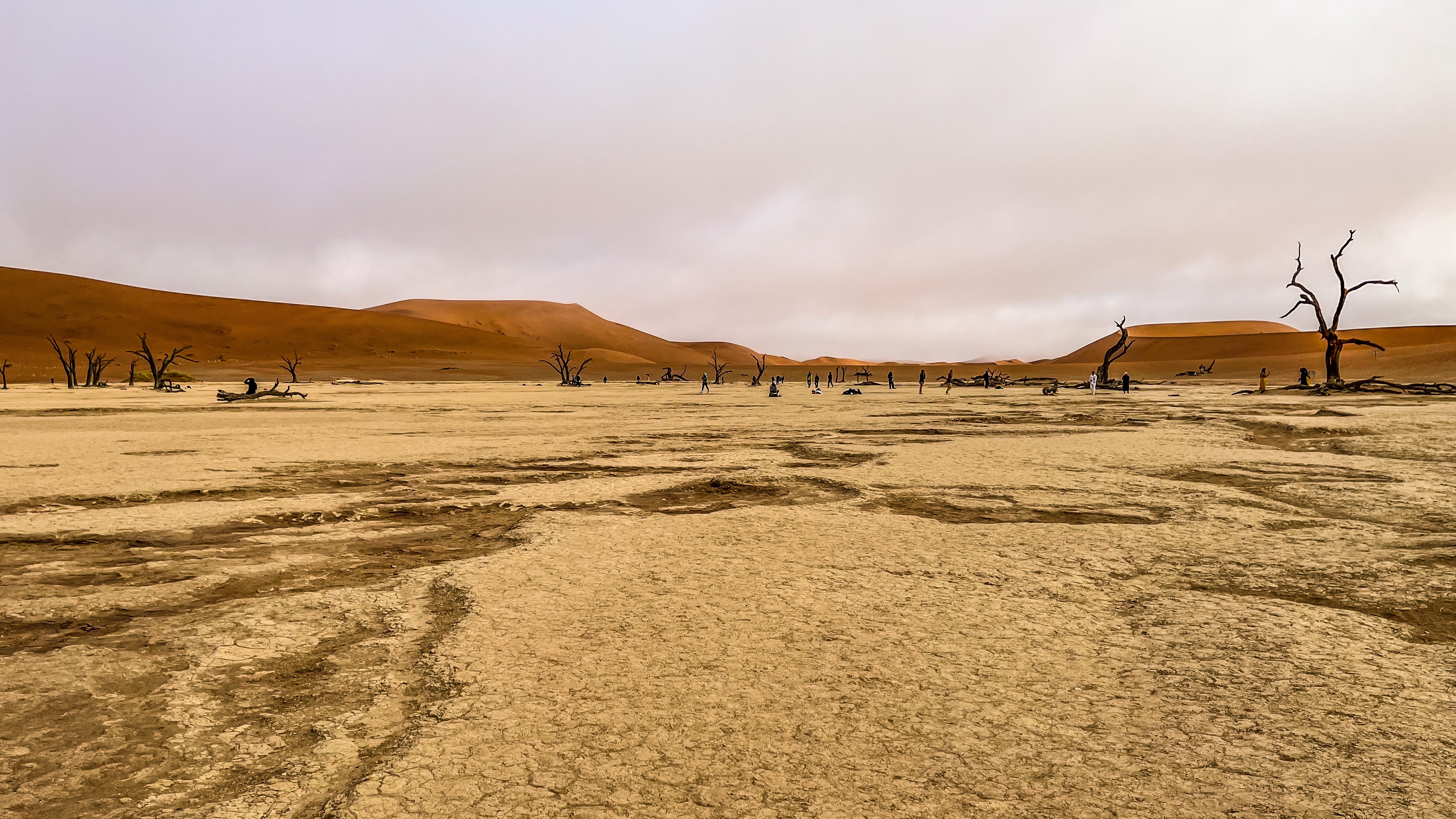 Tivemos a sorte de ver o local em um cenário com nuvem e neblina, algo que acontece três ou quatro vezes ao ano, segundo um guia local. Os troncos retorcidos e pretos são de árvores que estão lá há mais de 900 anos. Quando as dunas invadiram o rio, o clima ficou tão seco que as árvores nem conseguiram se decompor, formando um cenário único.
