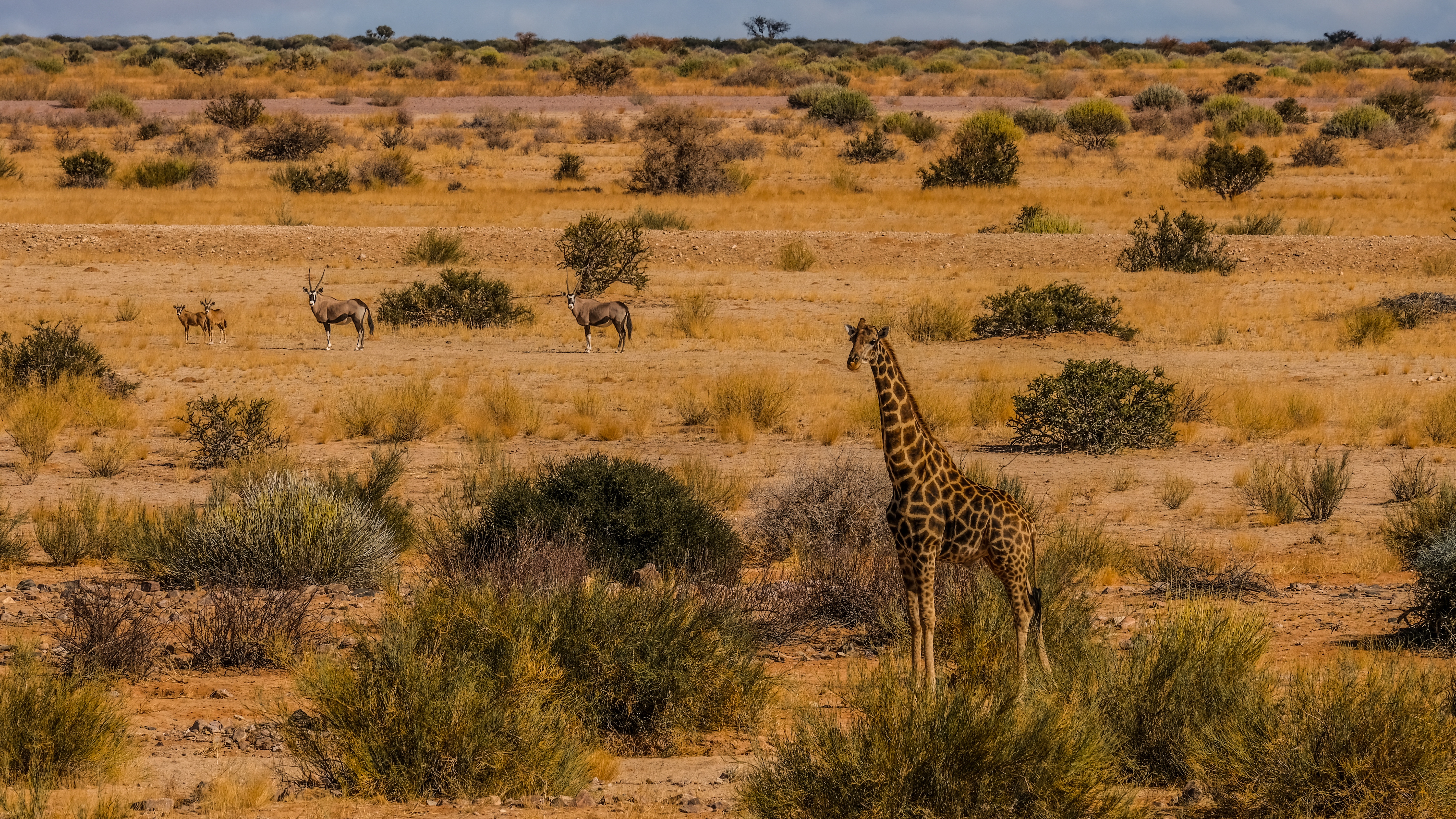 Alguns quilômetros de estrada depois, nos deparamos, ao acaso, com uma girafa comendo despretensiosamente seu almoço, no alto de uma árvore. Vimos, nos dias anteriores, vários órix, cervos e avestruzes, além de alguns macacos e cavalos selvagens. Encontrar uma girafa, no entanto, foi um marco.