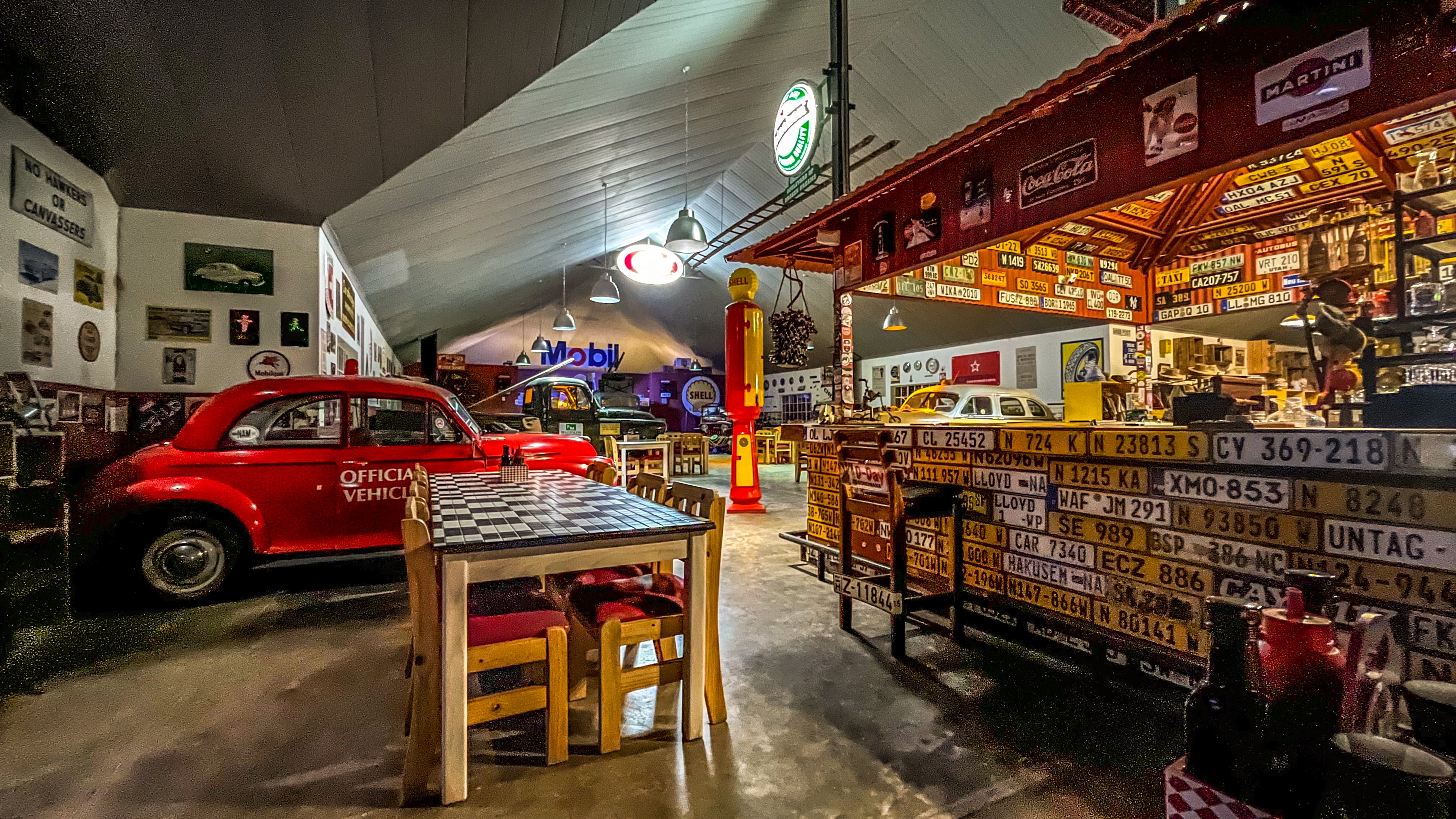 Esse foi nosso segundo camping mais caro (287 NAD/R$ 77,50 por pessoa), mas ao menos oferecia certas comodidades, como um prédio próximo com banheiros limpos, banho quente, pia e varal para lavar e pendurar roupas, além de um restaurante bem charmoso e quentinho, com vários carros antigos de decoração.