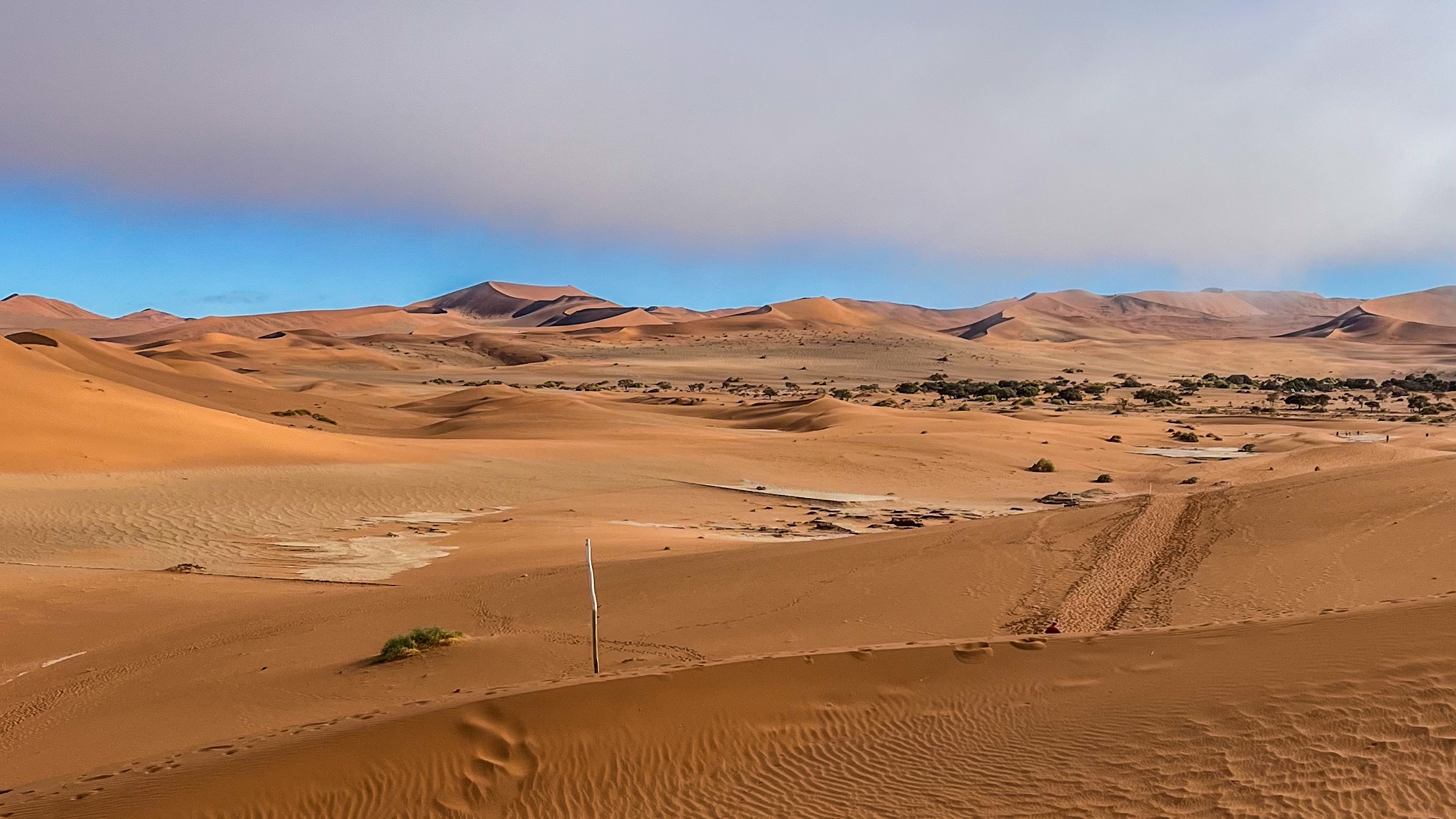 Em volta, há as dunas Big Mama e Big Daddy, que fornecem uma vista espetacular, se o tempo estiver limpo —o que eventualmente aconteceu, então pudemos aproveitar o local com nuvem e com sol. De lá, fizemos uma pausa na Dune 45 para almoçar, pois há mesas de piquenique. Ninguém teve ânimo para subir, mas foi uma bela refeição com vista.