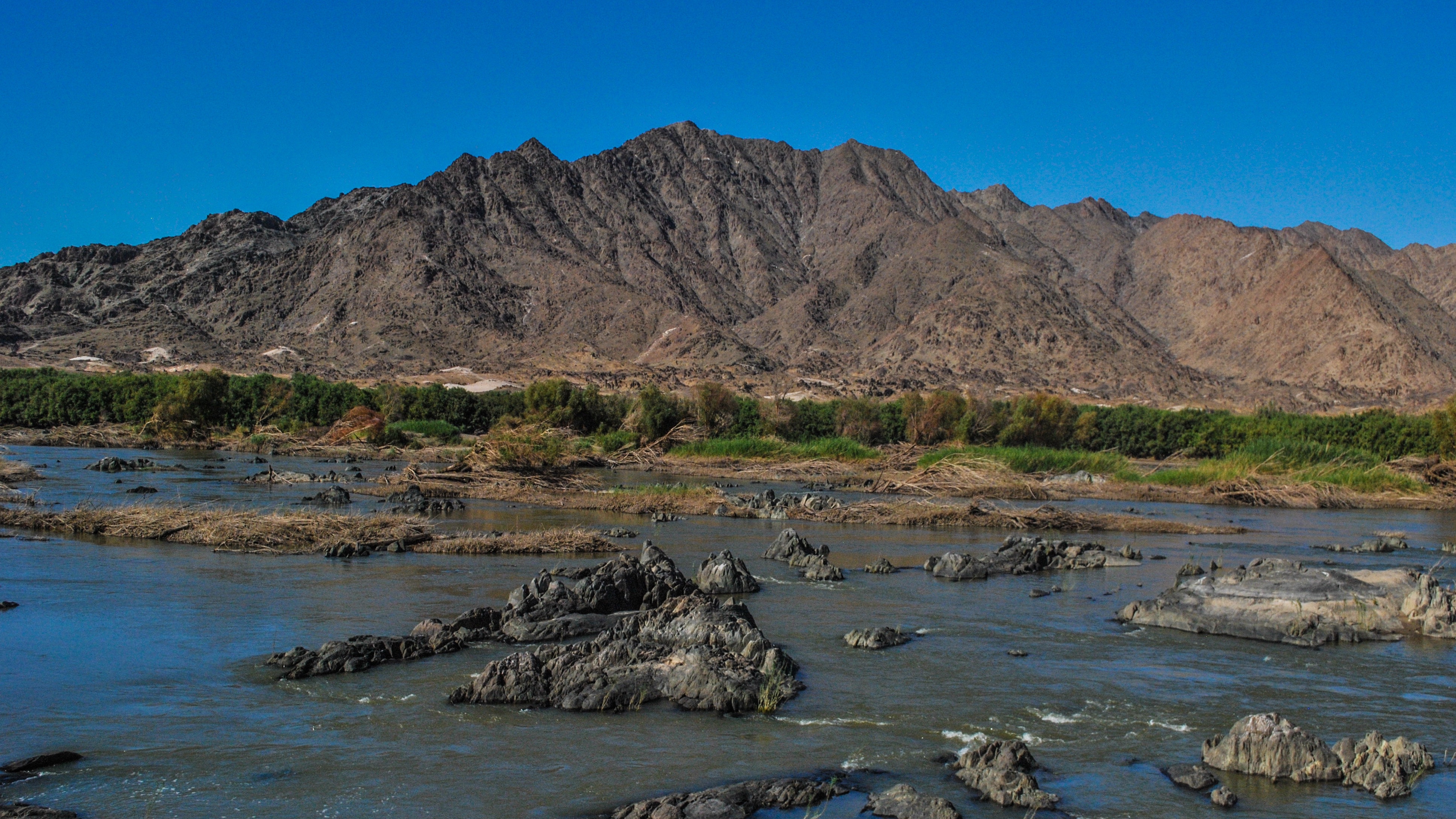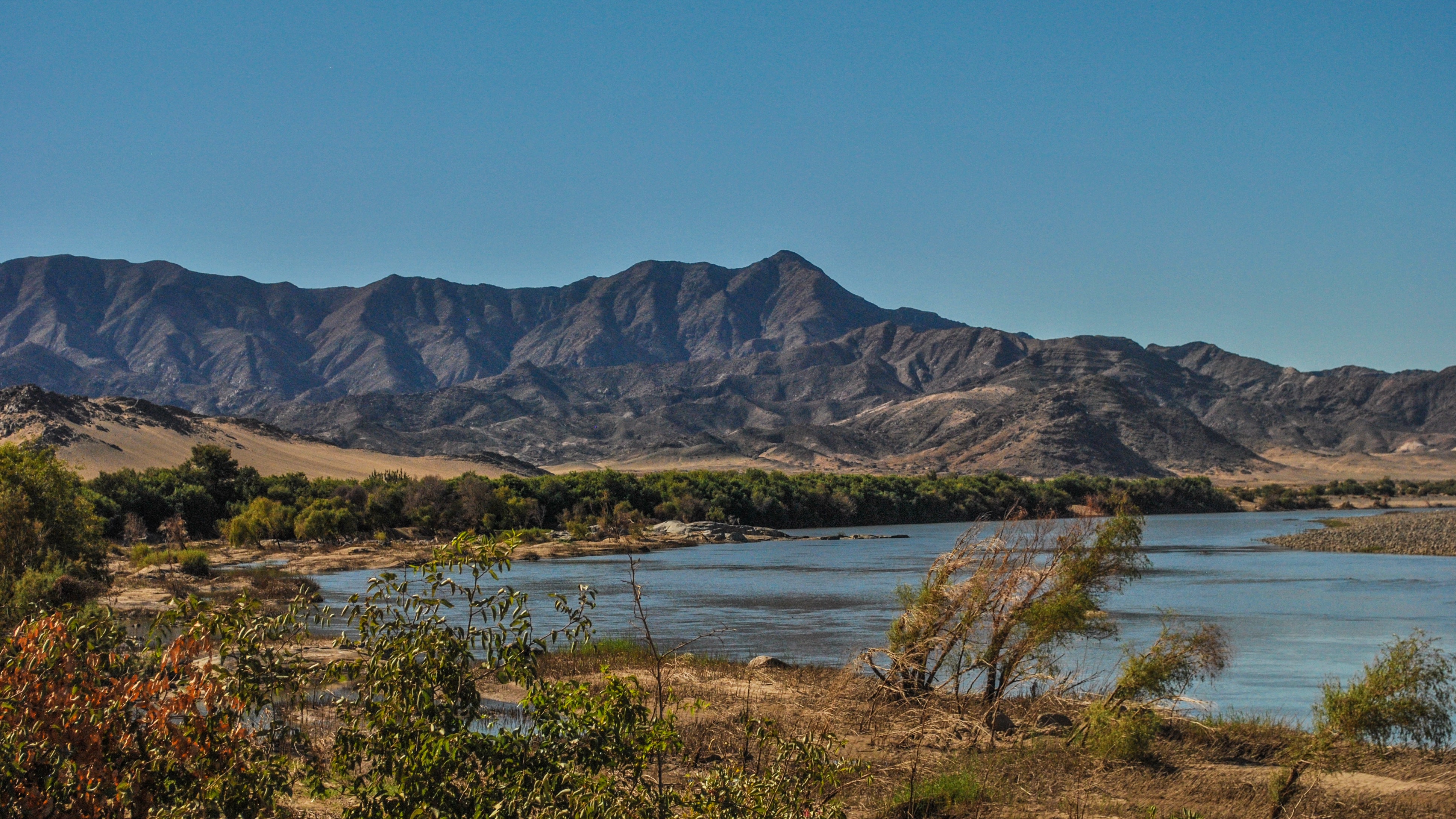 Nesse trecho, os dois países são divididos pelo rio Orange, e margeá-lo nos proporcionou viajar por trechos verdejantes, assim como um rio com águas bem azuis, ao longe, e que, ao nos aproximarmos, víamos que, na verdade, eram marrom.