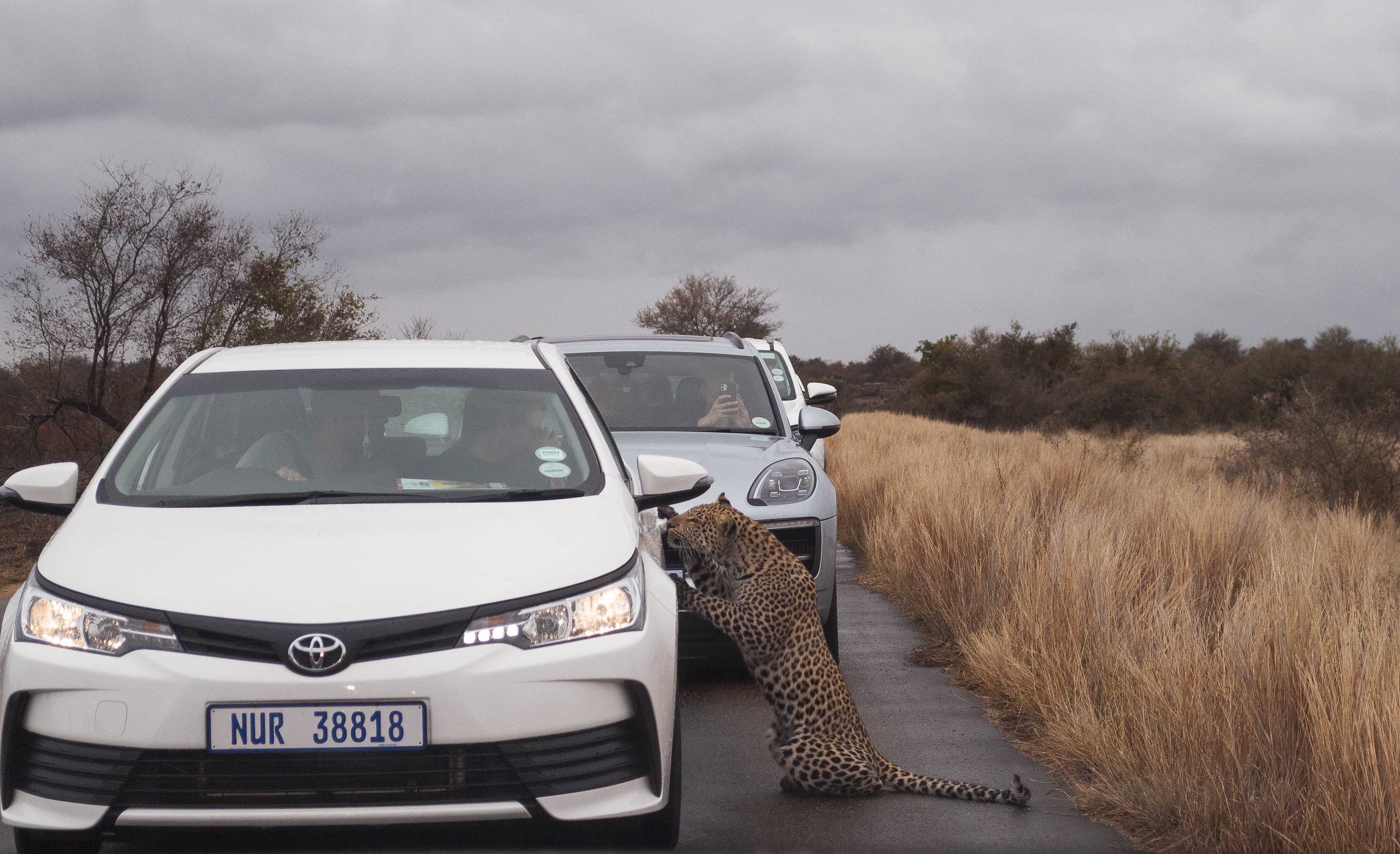 Por dois dias ficamos perto de um leopardo, que não se importava em andar no meio dos carros –ele inclusive ficou embaixo de um, como faria um gato. Em um momento, o felino se aproximou da porta de um veículo, sentou e colocou sua pata na maçaneta, claramente tentando abri-la. Para nosso espanto, a mulher demorou uma eternidade para fechar a janela.