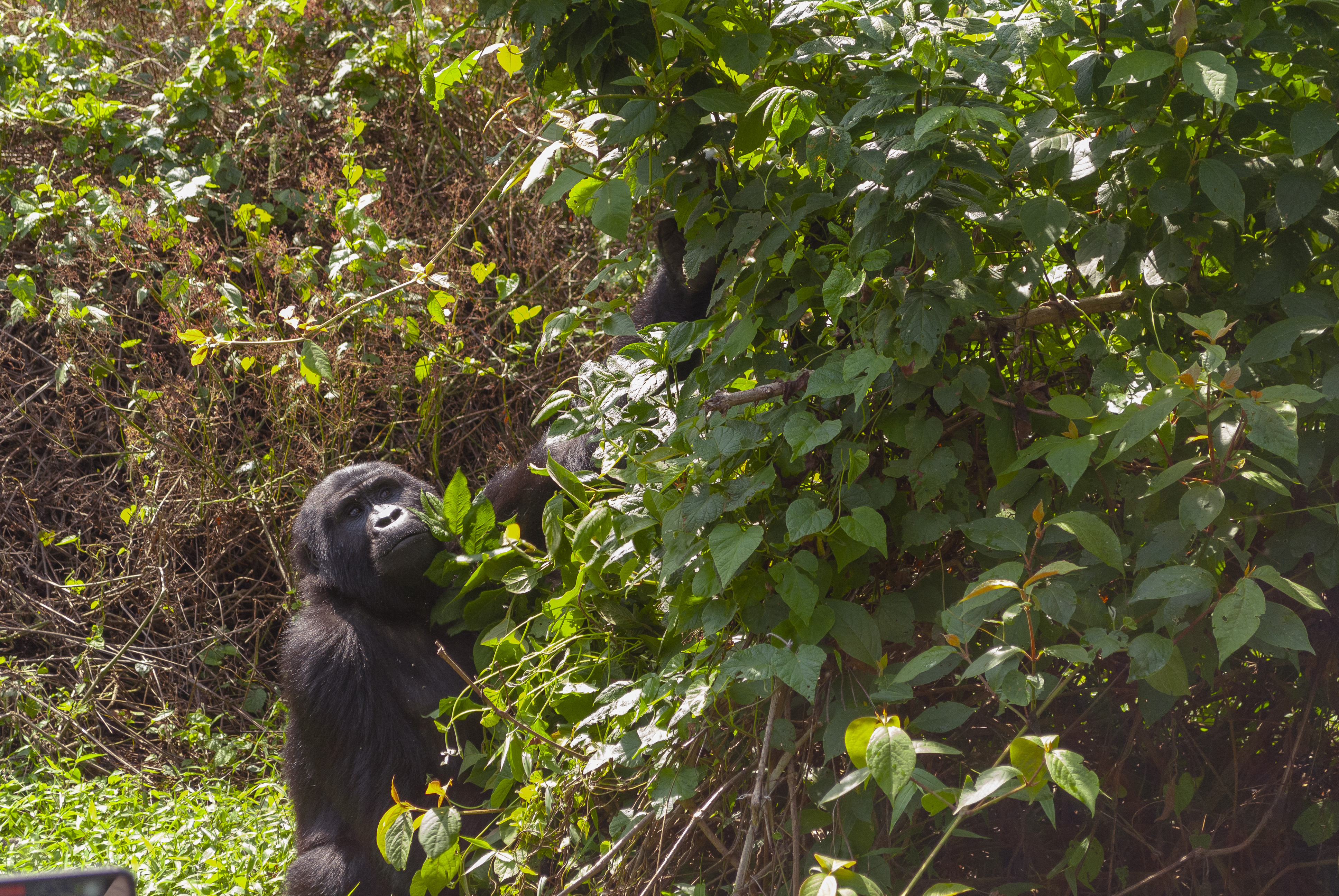 A grande estrela do passeio é o gorila macho que lidera o bando, o silverback —pelo nome, vocês podem imaginar que ele tem as costas prateadas. Eram 2 nessa família, e o mais velho e maior era o mais respeitado. E tinha bastante paciência para comer suas folhinhas.
