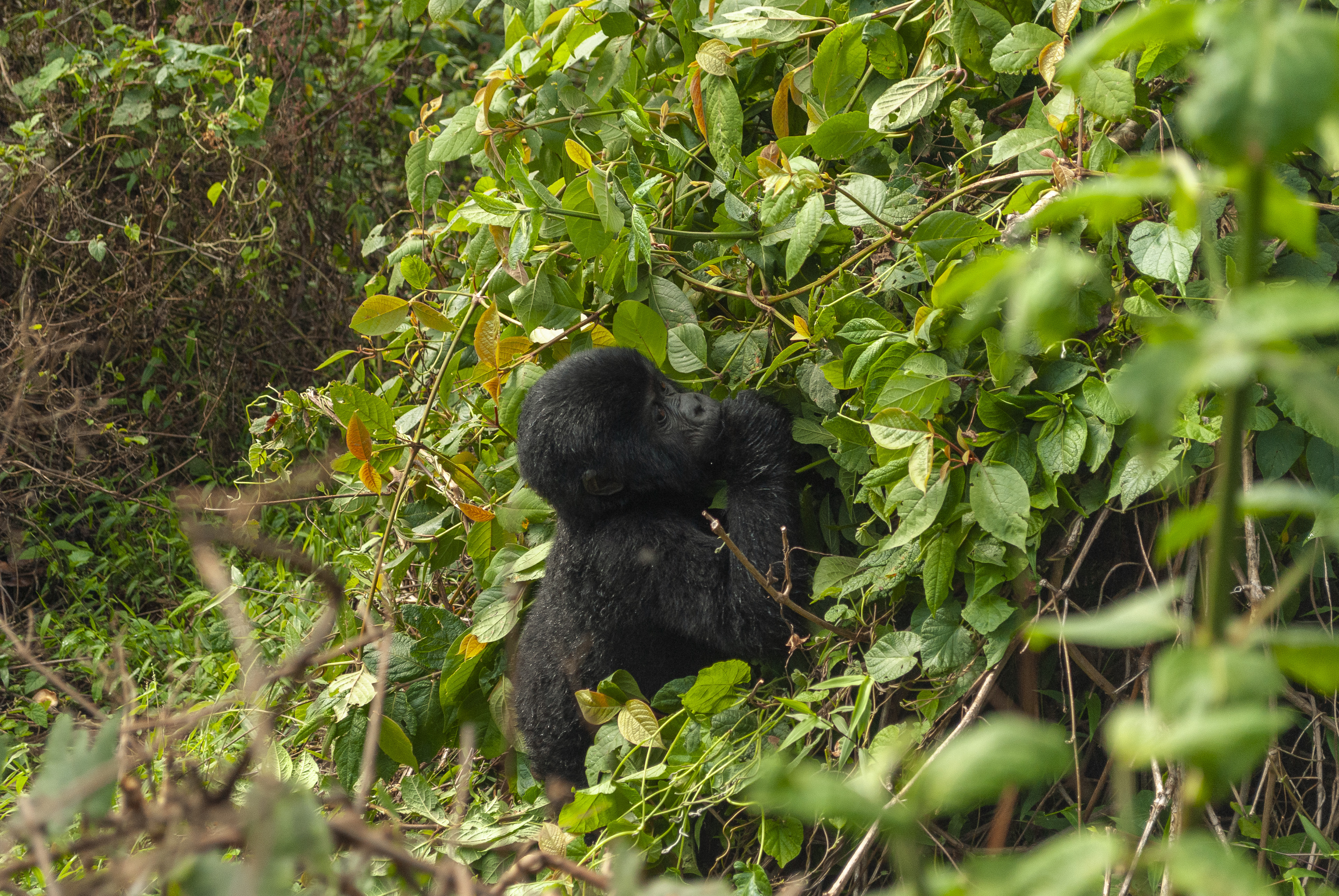 Agora, no fim de setembro, foi a vez de meter a mão no bolso para ter essa experiência incrível de ver os gorilas-das-montanhas. Eles se concentram em duas áreas próximas, entre Uganda, Ruanda e RD Congo. Enquanto na tríplice fronteira fica a floresta Virunga, que abriga cerca de 600 primatas, na Floresta Impenetrável de Bwindi, em Uganda, estão outros 400 animais.