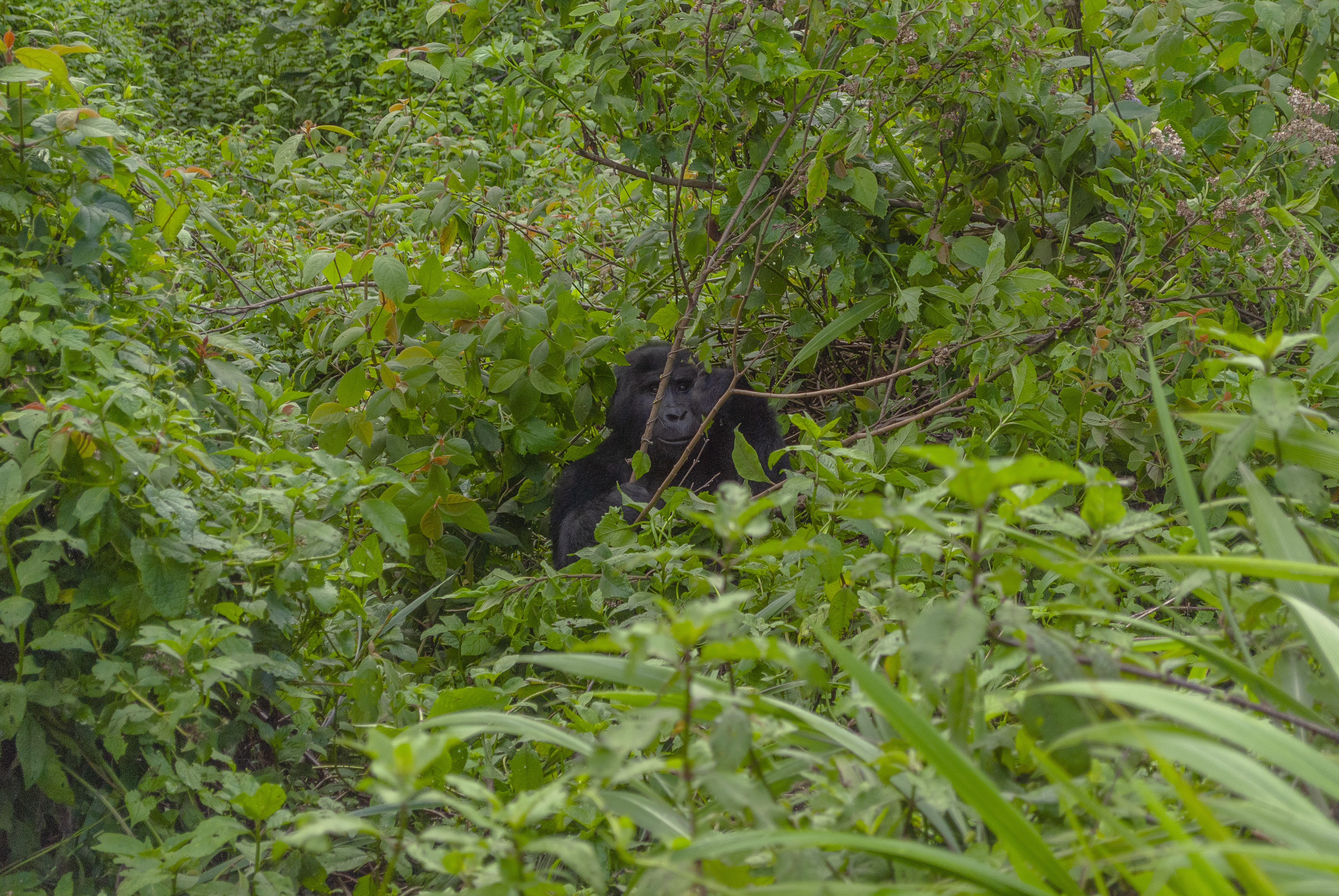Eis que, ao longe, vemos um ponto preto se destacando no verde da floresta. Na sequência, ouvimos gritos, vindos dos rangers-babás. Sim, pessoa que nos lê, era um gorila! E não tinham se passado nem 30 minutos! Um misto de alegria e alívio dominou nosso despreparado corpo. Além de vontade de chegar mais perto dos primatas.