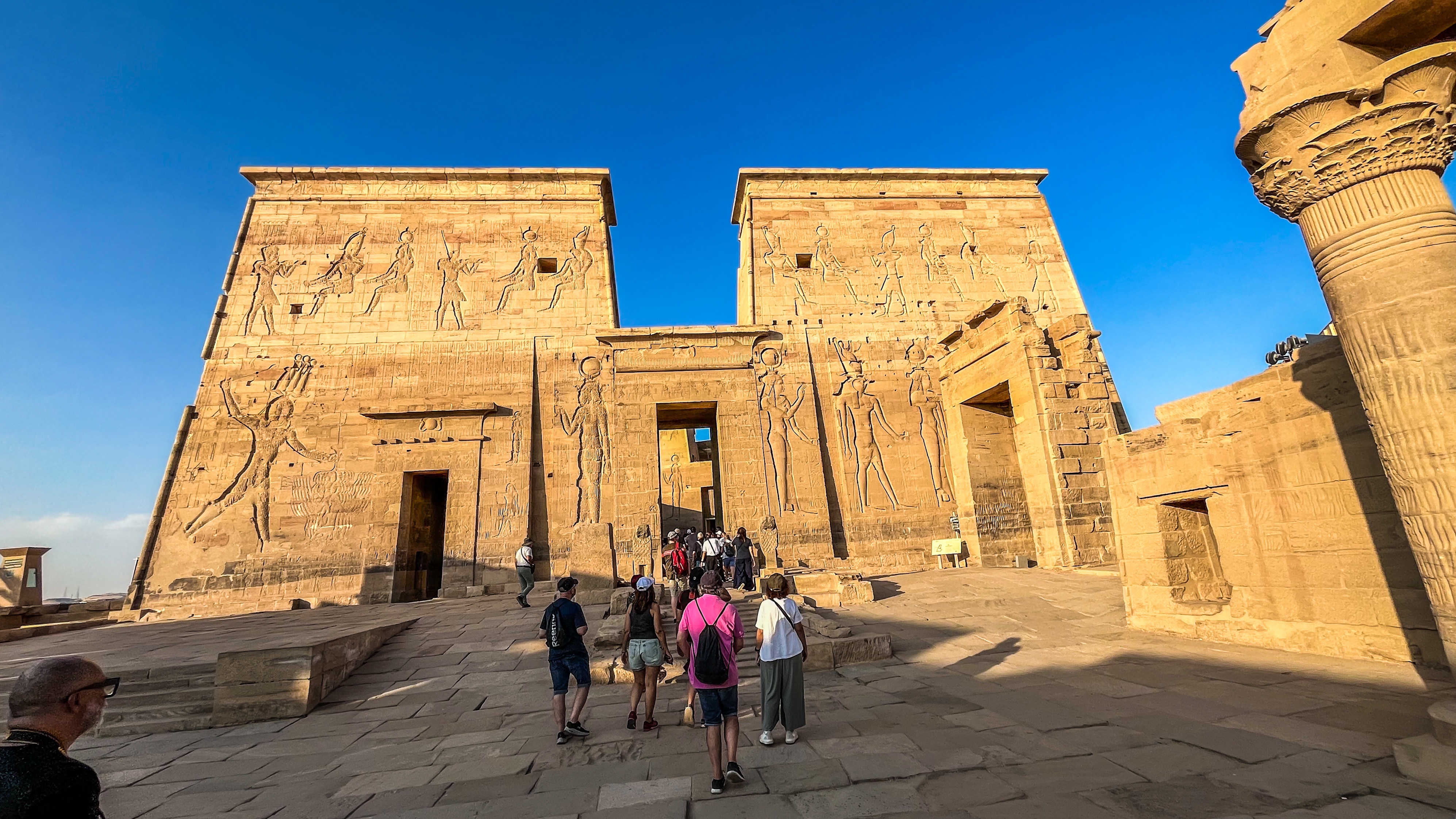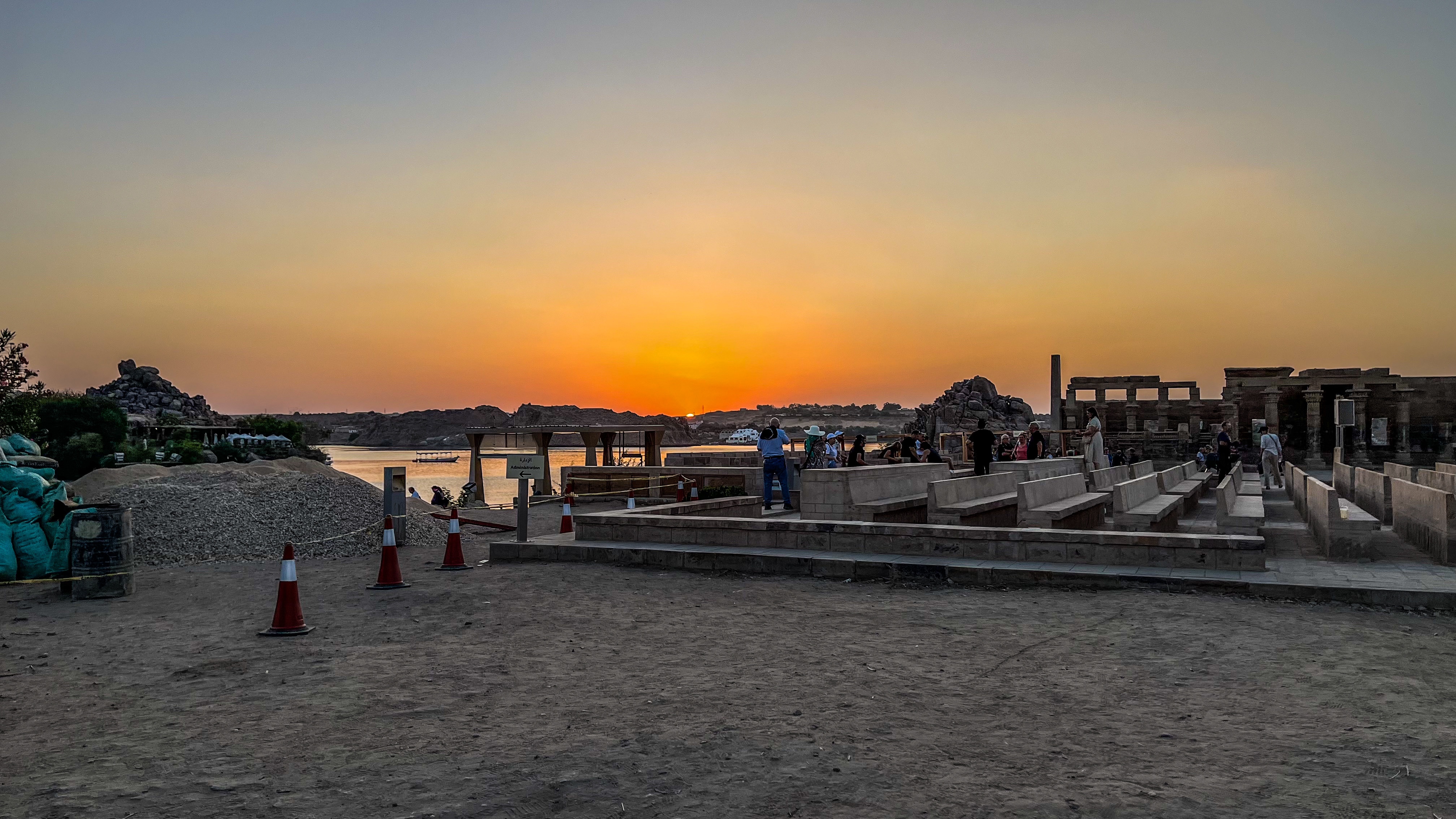 Por fim, terminamos o dia na ilha Angelica, onde visitamos o templo de Philae. O complexo helênico —com características gregas e egípcias— na verdade ficava na ilha de Philae, mas a construção da barragem deixaria o local quase todo submerso, então ele foi levado para onde está hoje.