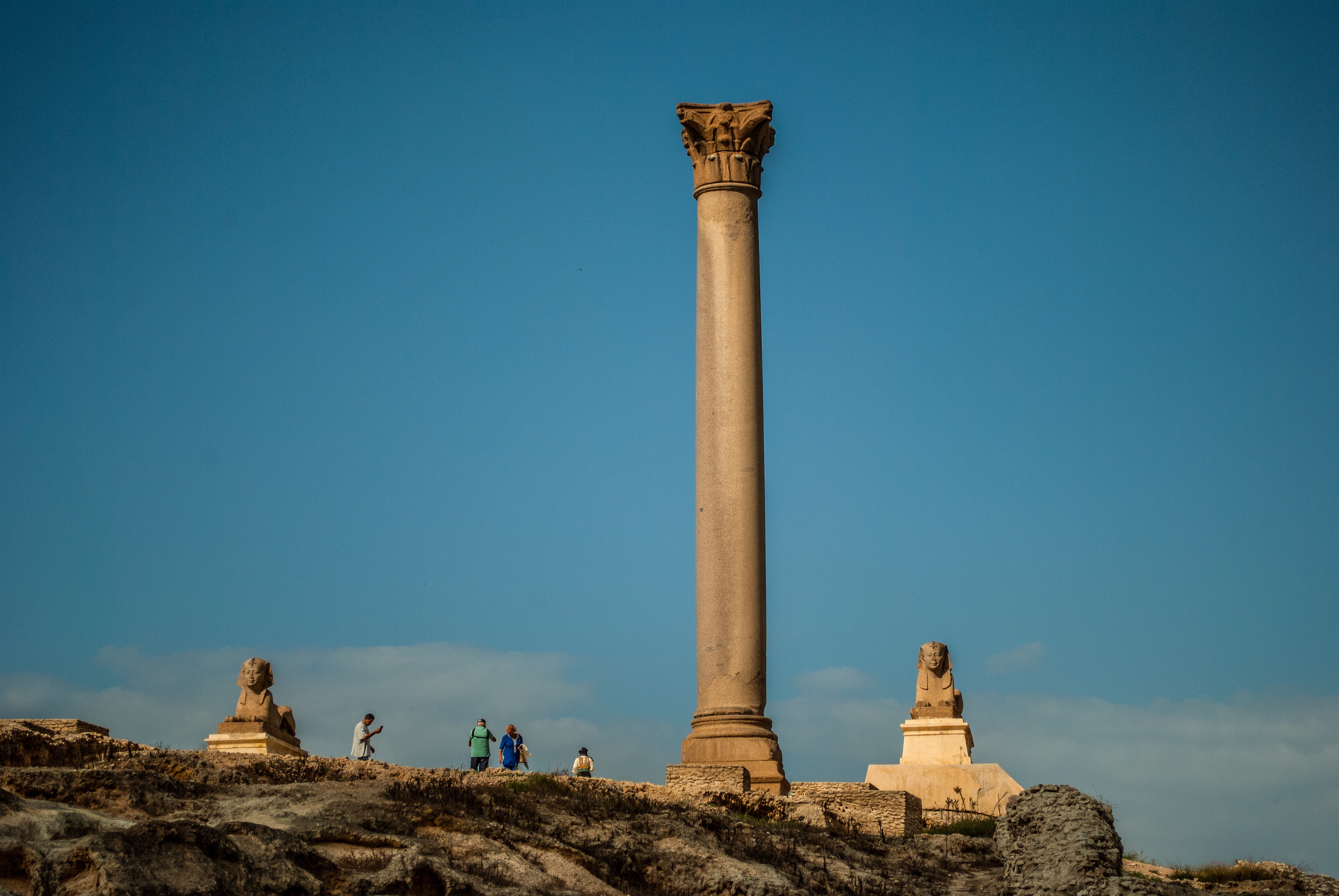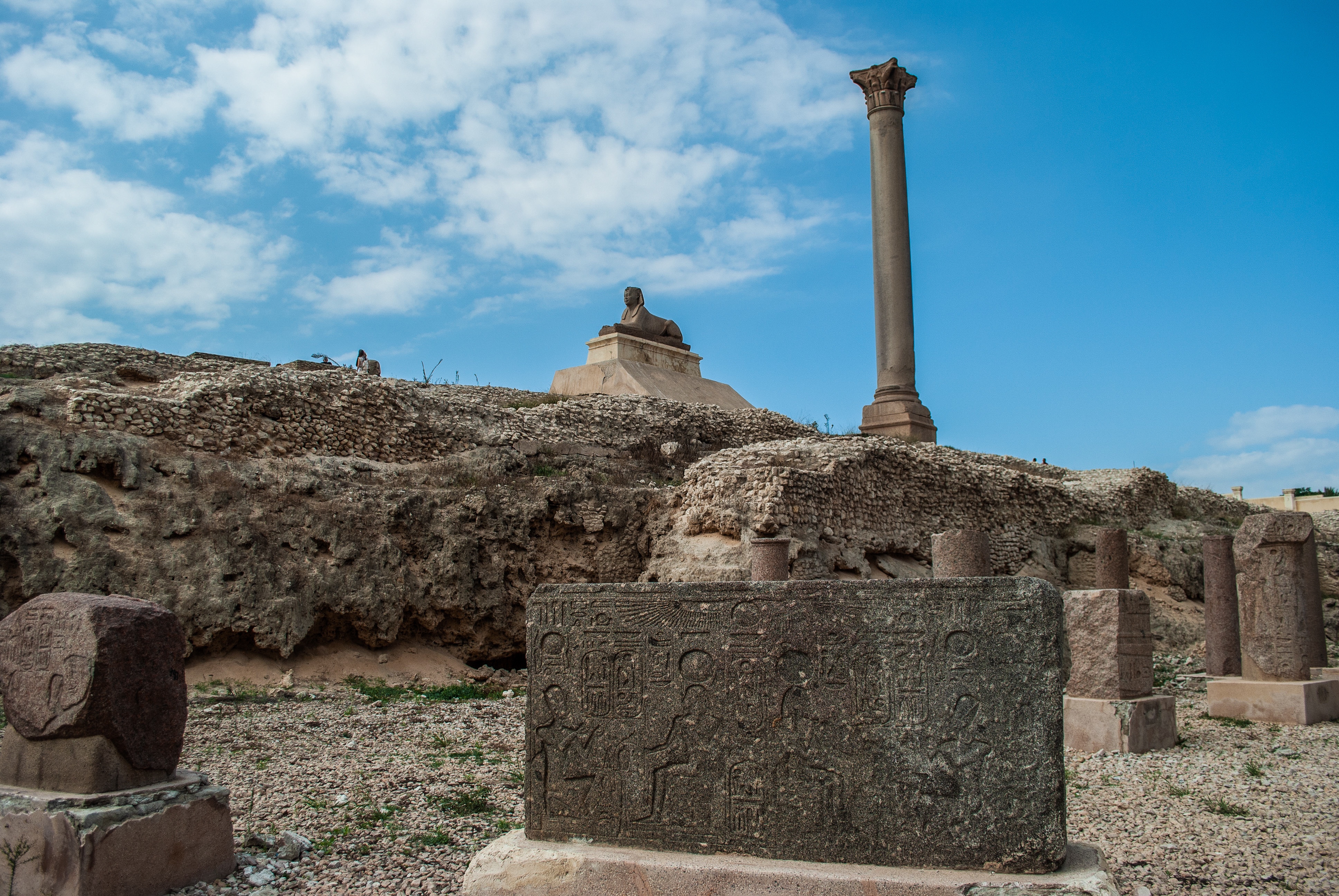 Em outro local, vimos a enorme coluna de Pompeu, que sinalizava aos navios que chegaram a Alexandria, assim como o farol citado anteriormente. Construída com as pedras de Assuan, foi transportada pelo rio Nilo, que desagua nesta região. O espaço abriga ainda algumas esfinges e pedaços de colunas com características romanas, descobertas durante a construção da nova biblioteca.