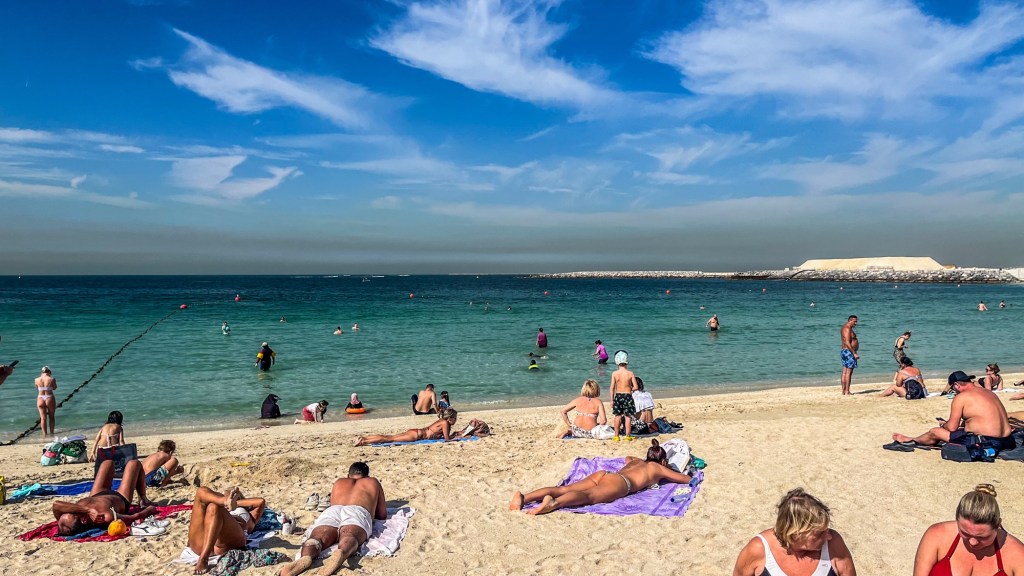Dubai fica ainda no litoral, e isso significa praias à beira do golfo Pérsico! Mesmo que seja um país islâmico como a vizinha Arábia Saudita, nas areias de Jumeirah as mulheres usam a roupa de banho que quiserem, do biquíni ao burquíni. O que é proibido por lá é fazer farra na água, e vimos um grupo de jovens imigrantes serem expulsos e outro de mais velhos levar uma advertência.