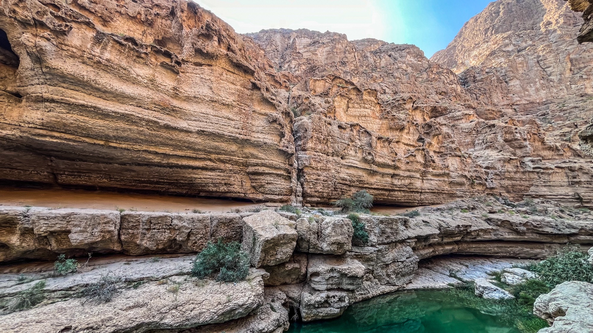 Na Jordânia, a grande atração é o deserto de Wadi Rum, enquanto em Omã os mais famosos são o Wadi Bani Khalid e o Wadi Shab. Fomos ao segundo, em um carro alugado, por ser a 1h30min de Mascate. O veículo acabou custando um pouco caro (R$ 430,50), mas ainda assim saiu mais em conta que as opções que vimos de tour online, na casa de US$ 80 por pessoa.