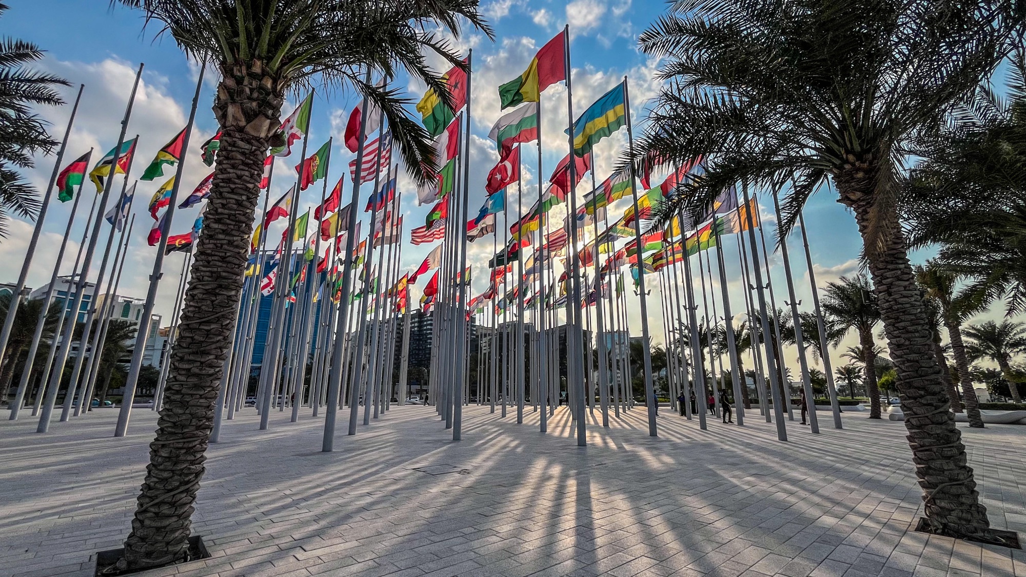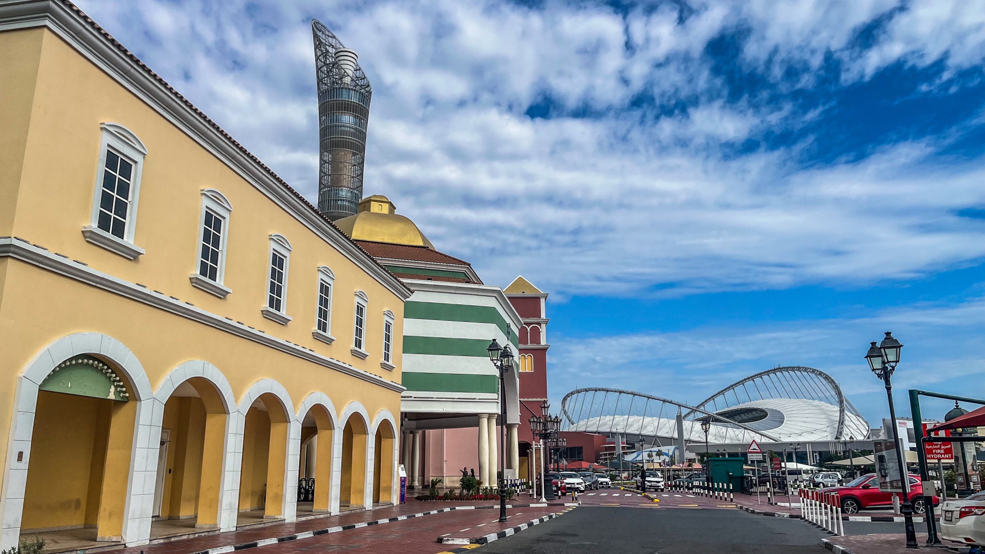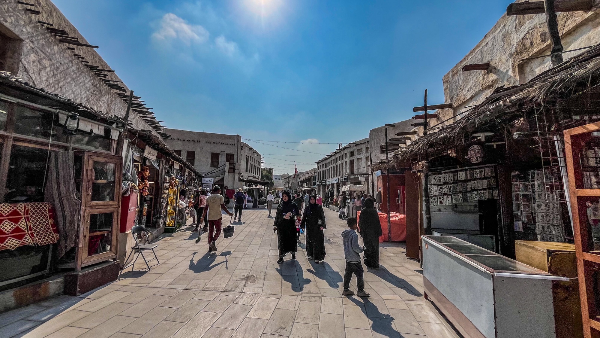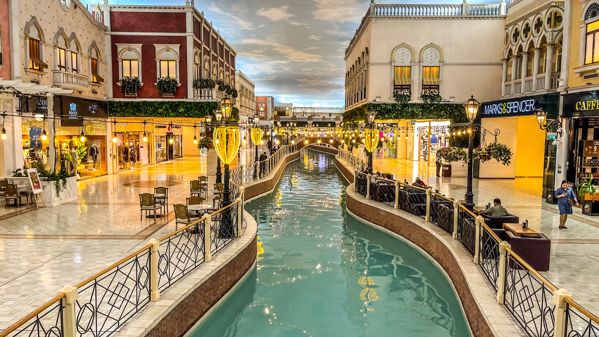 Nosso passeio por Doha começou no Villaggio Mall, um shopping que se tornou atração por seus corredores cortados por um canal e fachadas de lojas feitas para parecerem casas venezianas. Meio cringe, ainda mais com um teto que imita o céu, mas lá fomos em busca do Carrefour, supermercado francês que talvez tivesse um espumante para brindar a chegada de 2024. Não tinha, mas aproveitamos para fazer nosso conteúdo de compras e ainda garantimos um power bank a um bom preço.