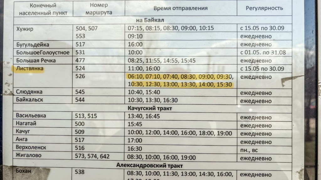 Essa cidade não está na rota da Transiberiana, e a visitamos num bate e volta de dois dias (fomos de ônibus e voltamos de van) a partir de Irkutsk. O motivo principal era ver de perto o lago Baikal, o mais profundo do mundo. Pela primeira vez chegamos a um lugar sem reserva de hospedagem e, numa breve caminhada na principal via, à margem da água, achamos uma pousada familiar, com uma bela vista para o Baikal.