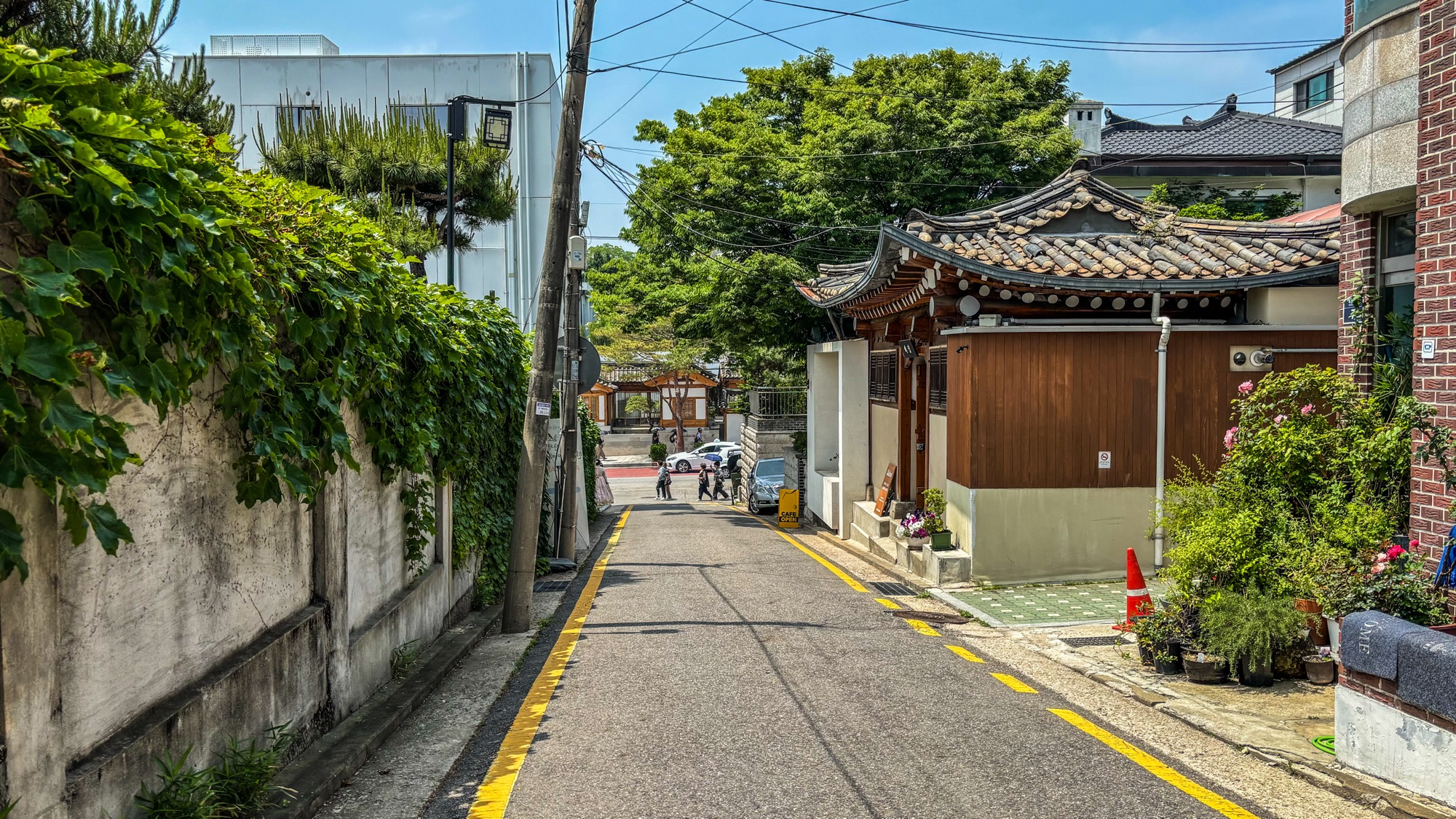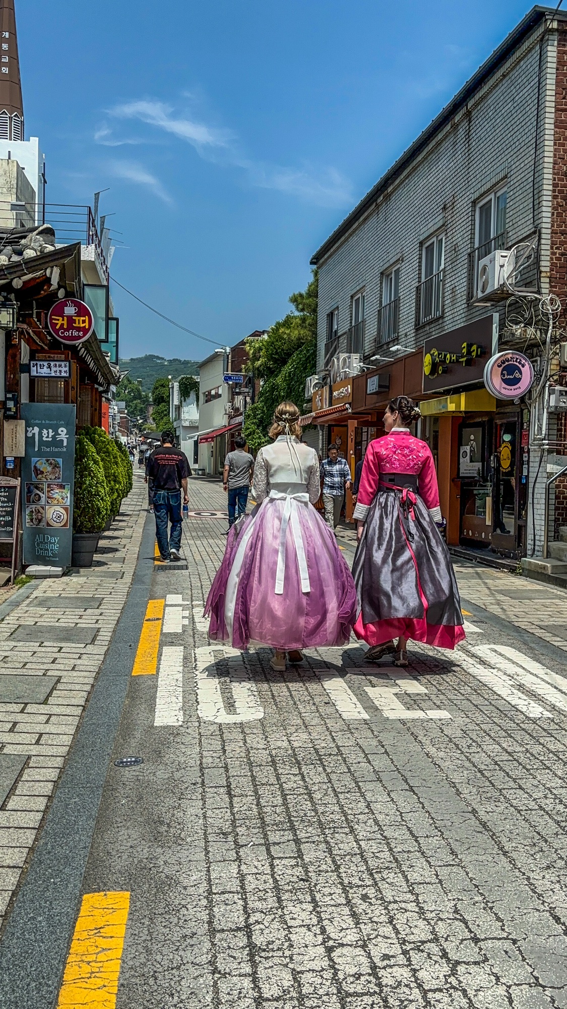 Passeamos pela clássica e turística região de Bukchon, que concentra casas de arquitetura antiga e muitas lojas de suvenir. Por ali moravam funcionários do alto escalão da dinastia Joseon, a última e mais longeva a comandar o território, de 1392 a 1897. Também foi nosso primeiro contato com estrangeiros vestindo hanbok, as roupas tradicionais coreanas.