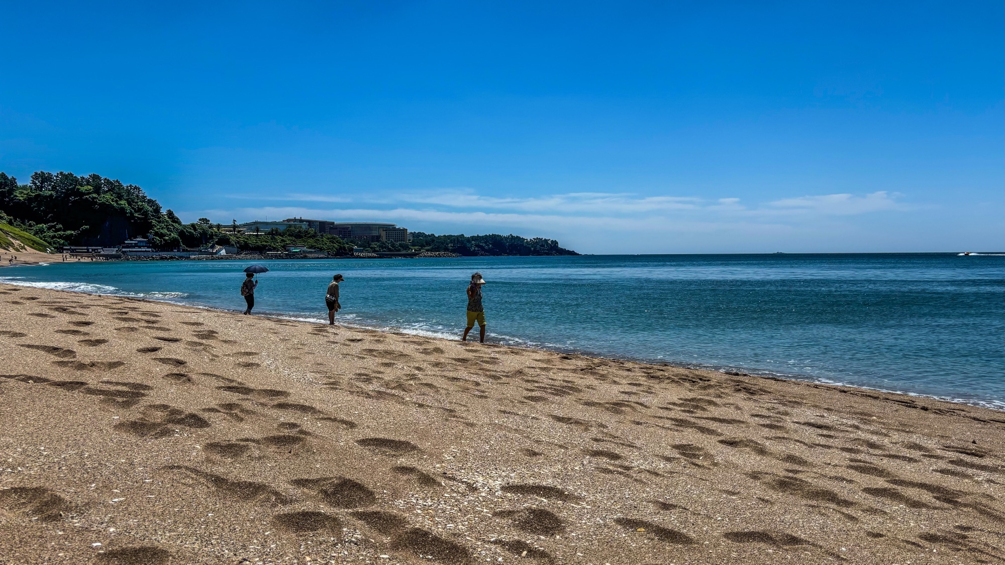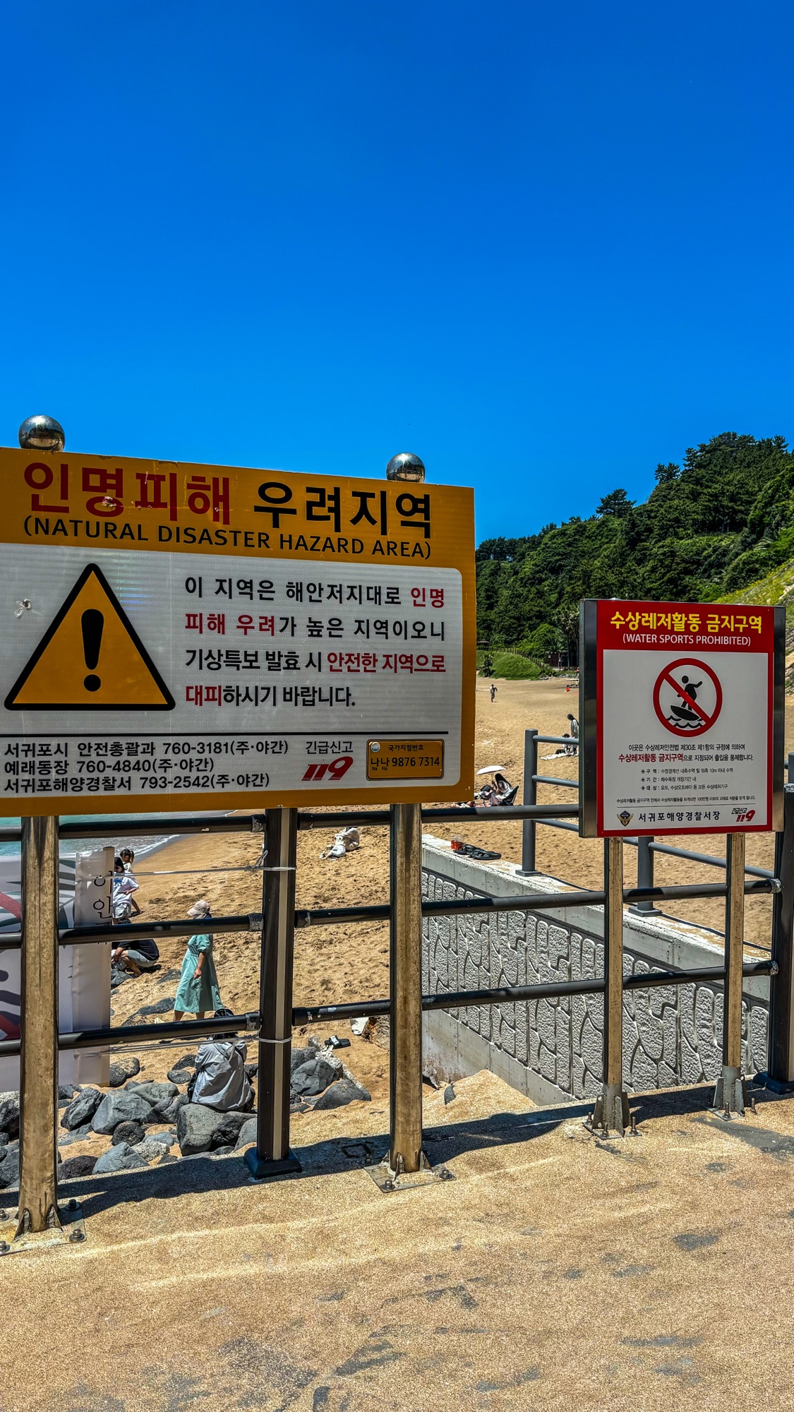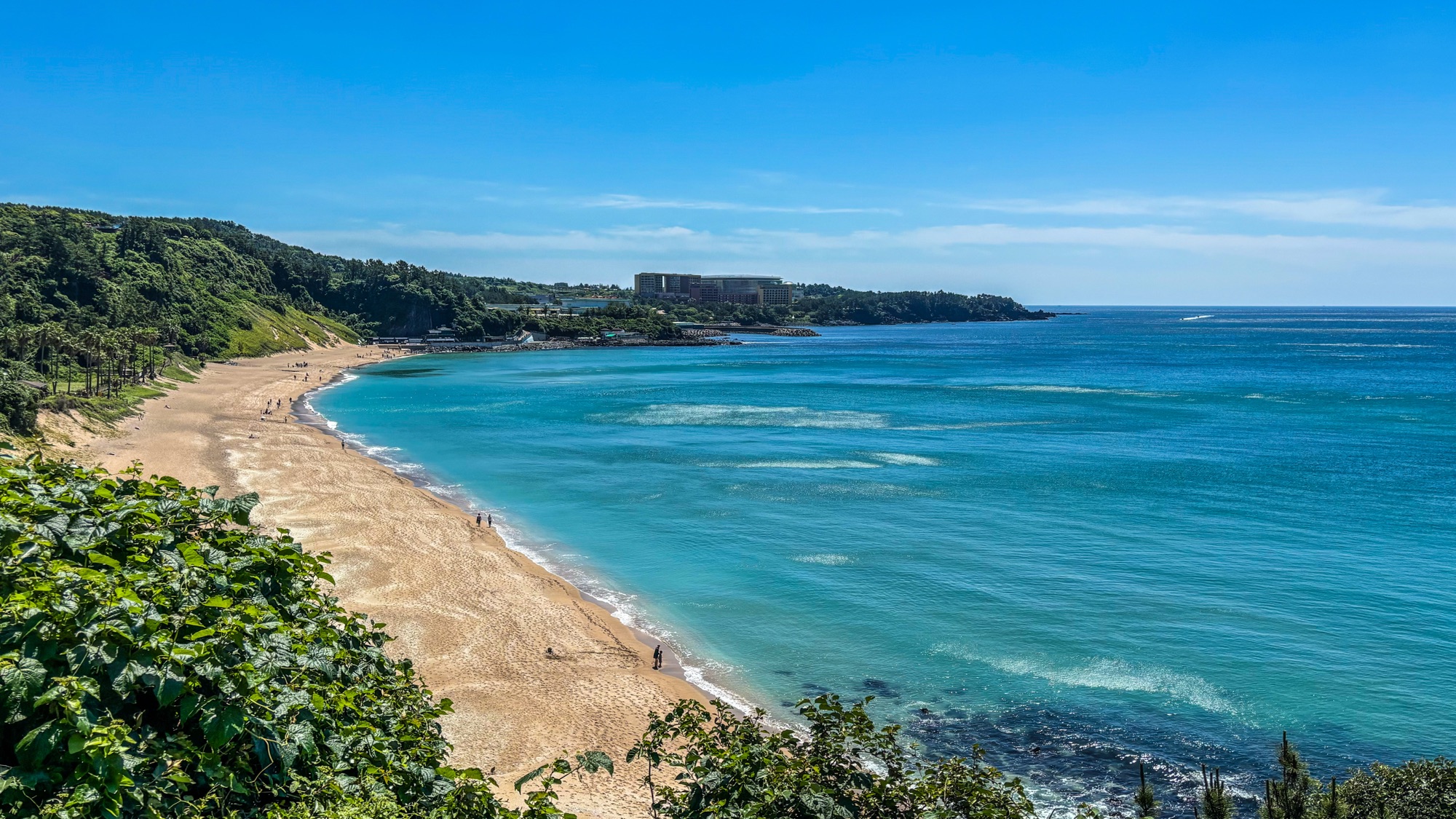 Os primeiros dias foram de chuva e céu nublado, então aproveitamos para descansar no hotel. Por sorte, o sol veio com força e pegamos um ônibus até a praia Jungmun Saekdal, onde vimos um mar extremamente lindo. Infelizmente, a beleza era proporcional à baixa temperatura da água, e nos contentamos a molhar os pés e apreciar a vista sentados na areia.