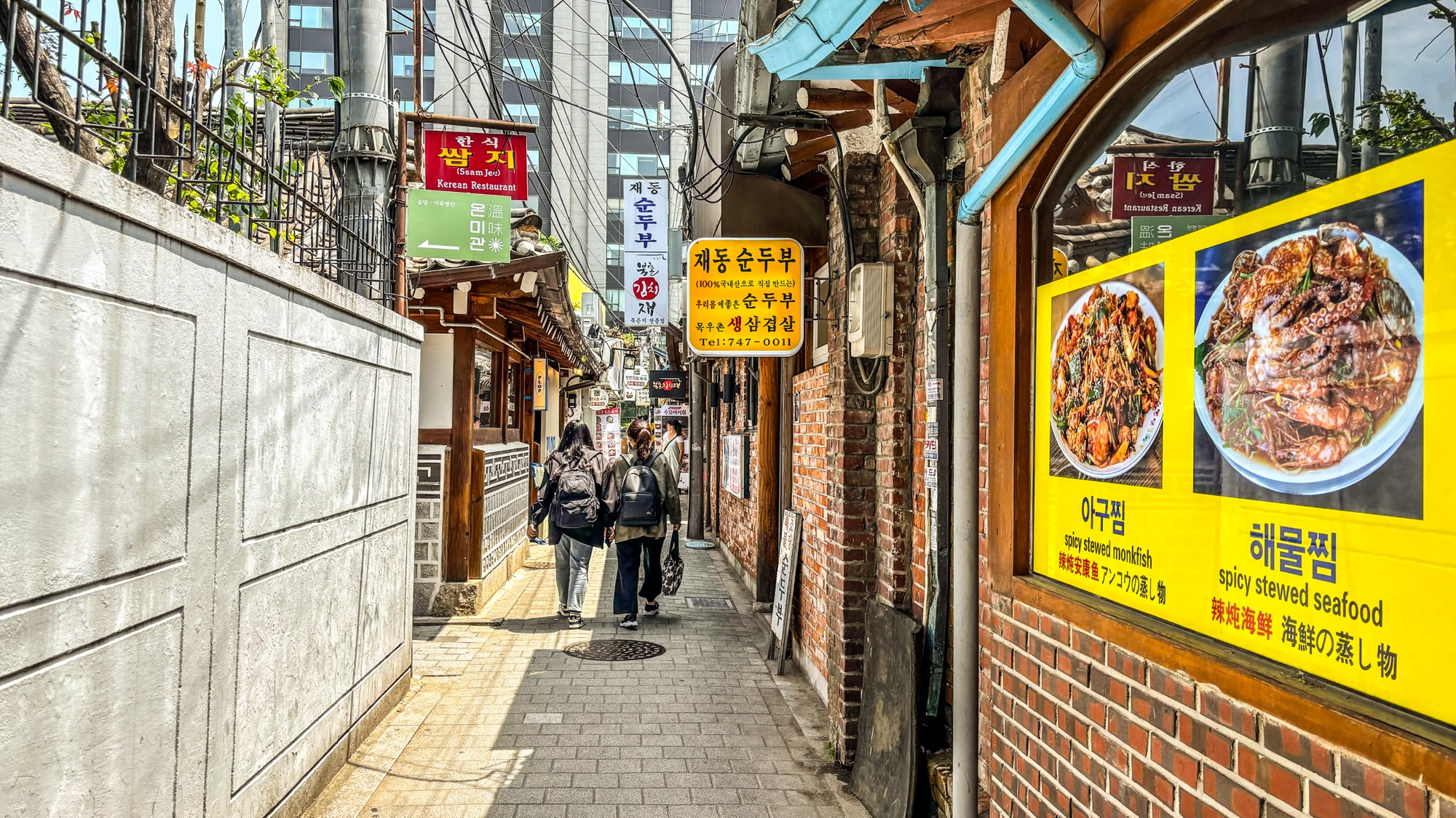 Nossa primeira parada foi em Seul, vindos da China. Como em Pequim, o sistema de metrô abrange boa parte da capital sul-coreana, o que facilitou os passeios por lá a partir da nossa hospedagem, a Joyful Stay, próxima à estação Sindang (43.750 wons/R$ 174,50). Neste e nos demais hotéis em que ficamos no país, éramos obrigados a tirar os sapatos numa pequena área na entrada do quarto.