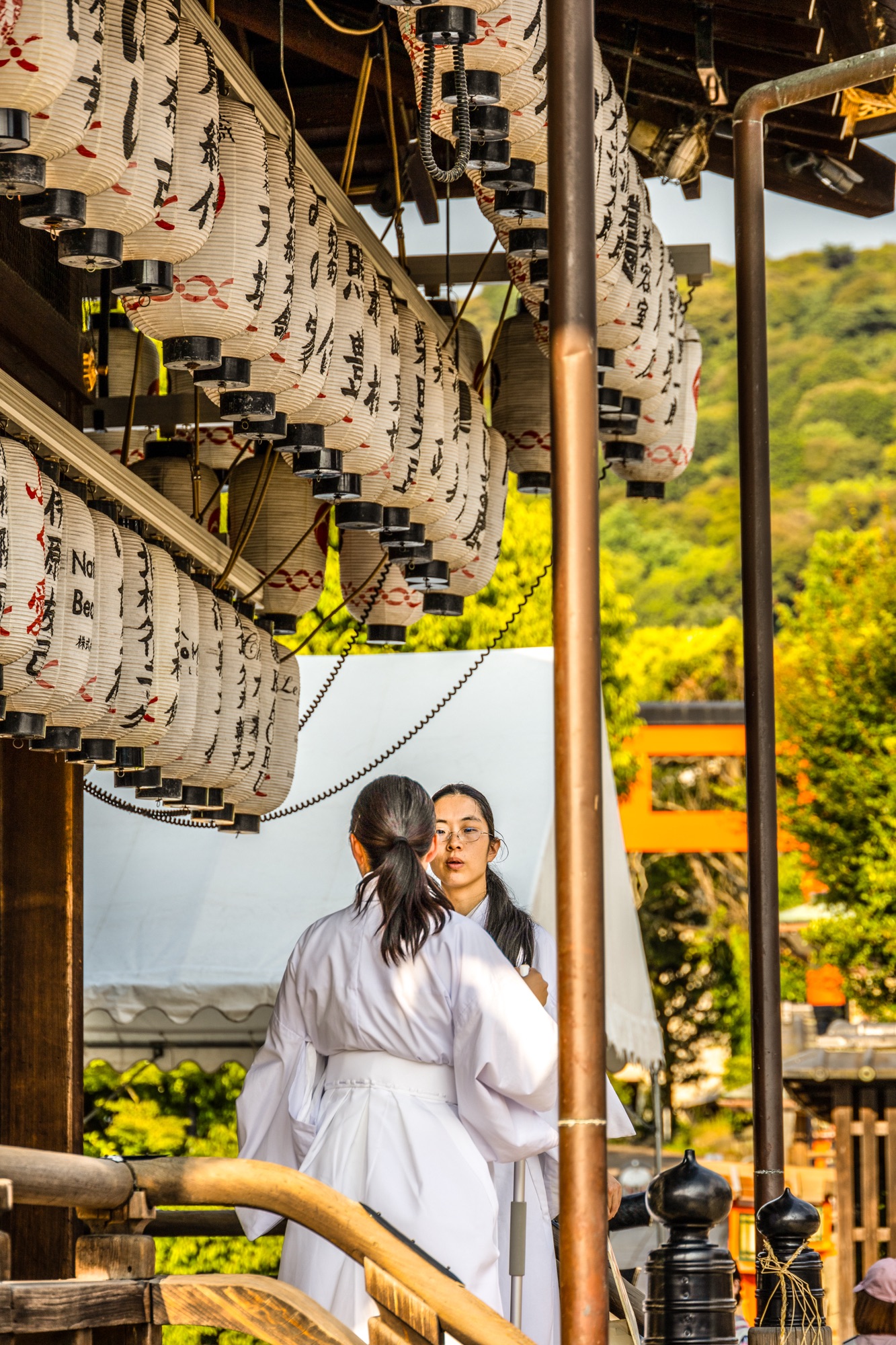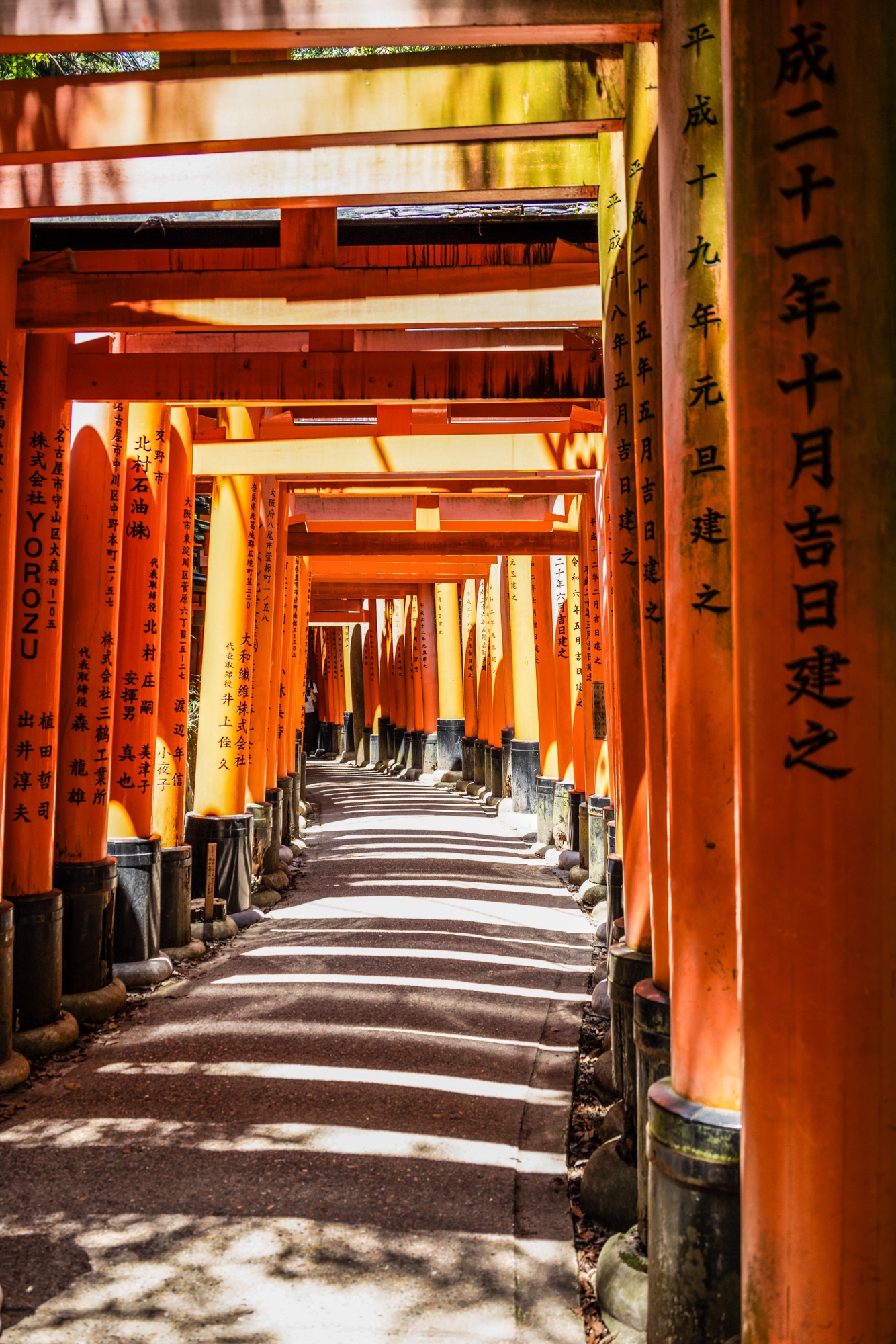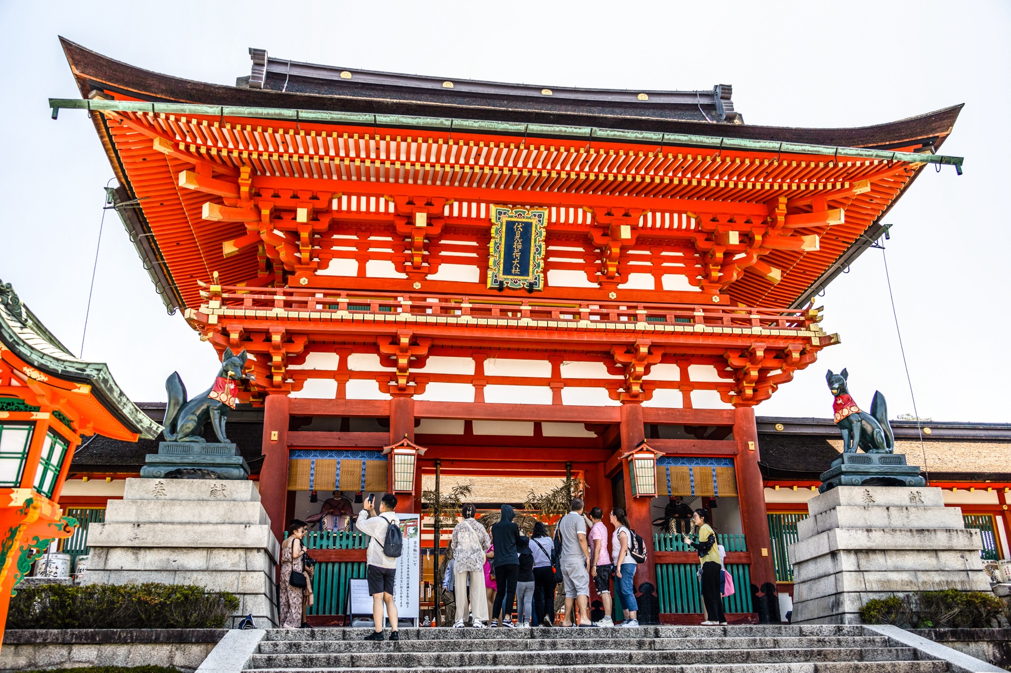 Visitamos o Fushimi Inari-taisha, um templo conhecido por incontáveis portões vermelhos, muito próximos uns dos outros, que formam um longo corredor. Por esse caminho, circulam vários turistas e moradores, muitas vezes com trajes tradicionais.
