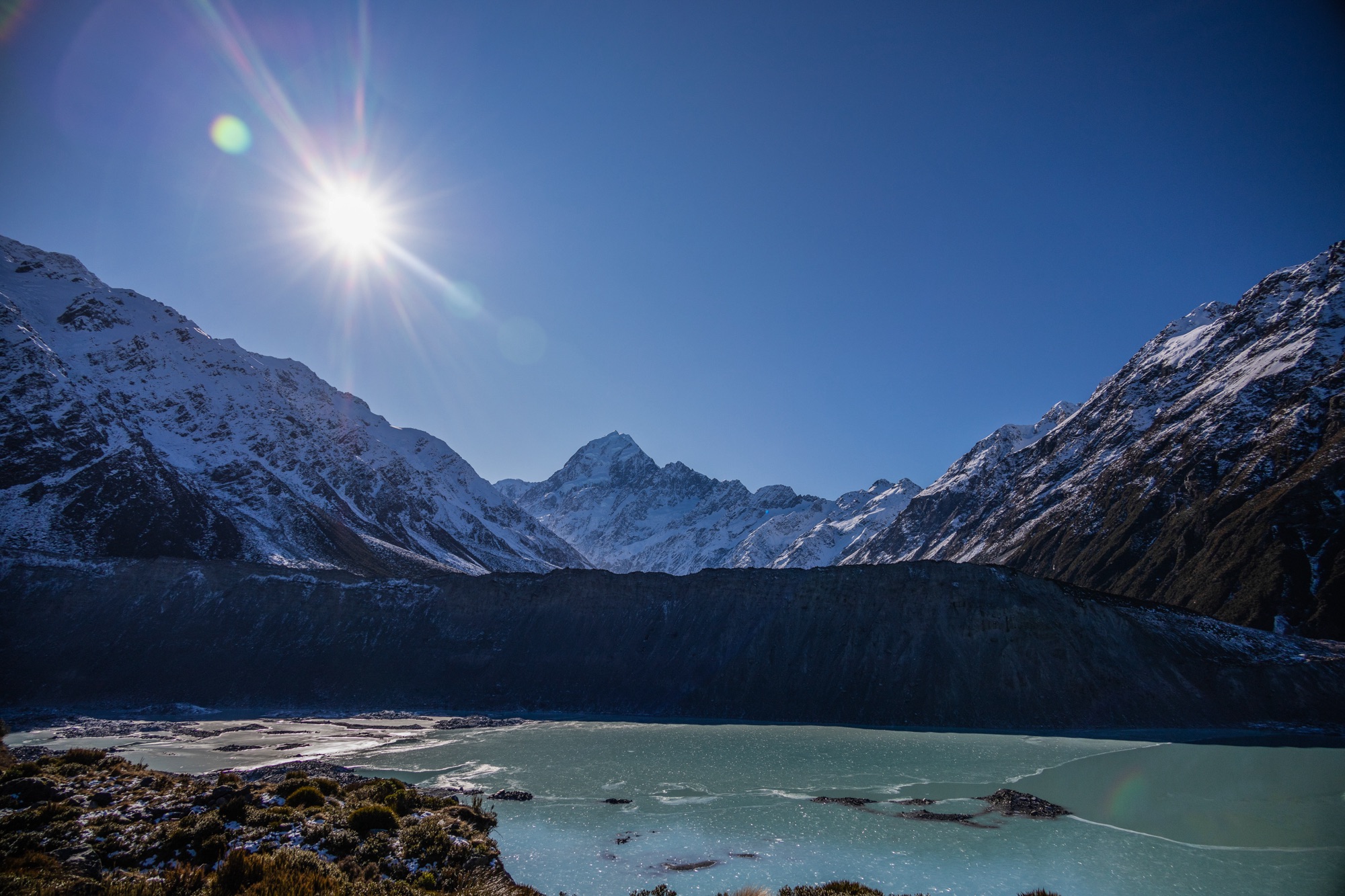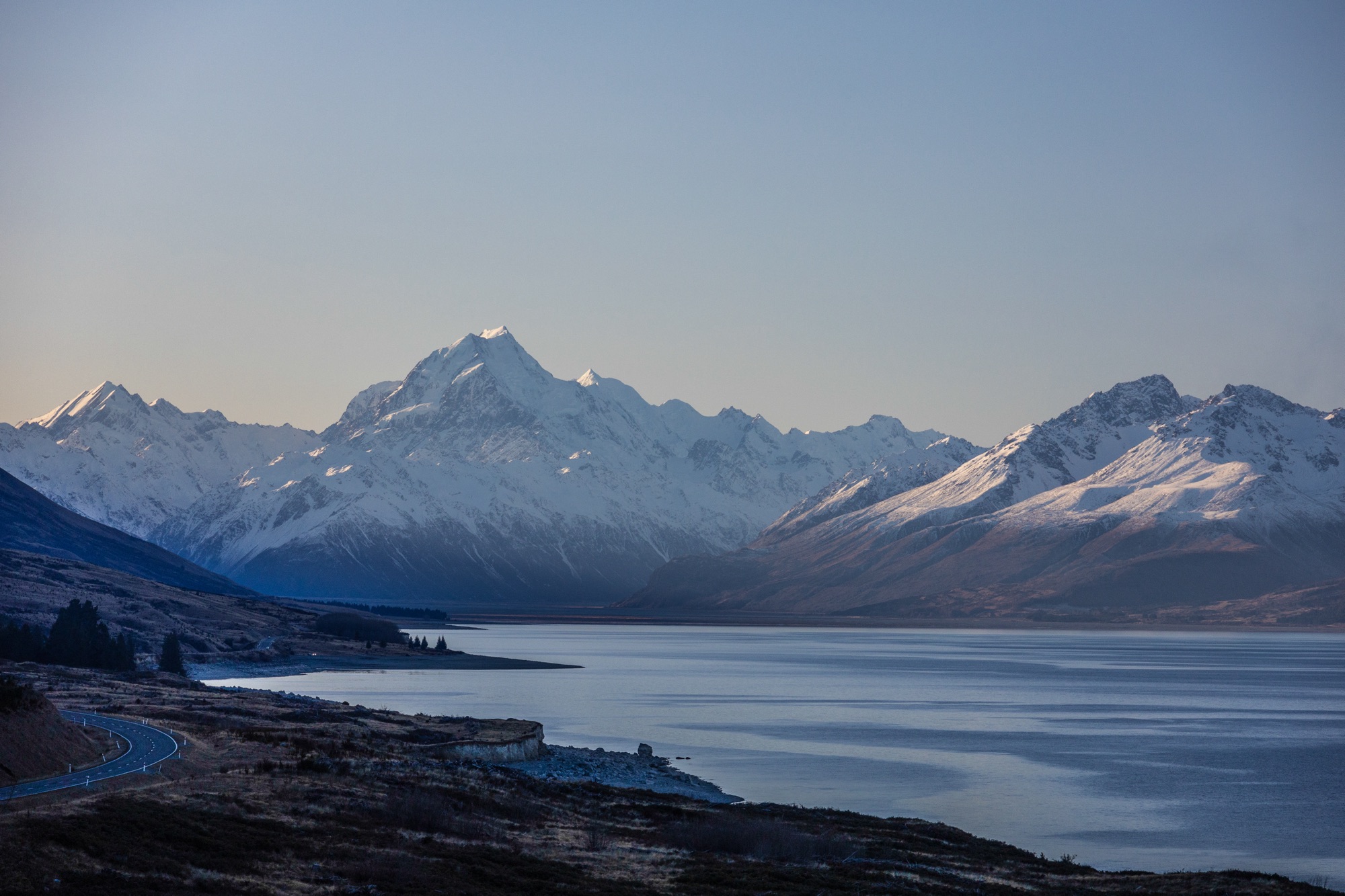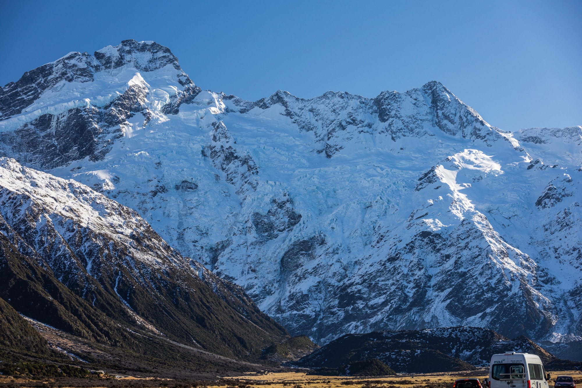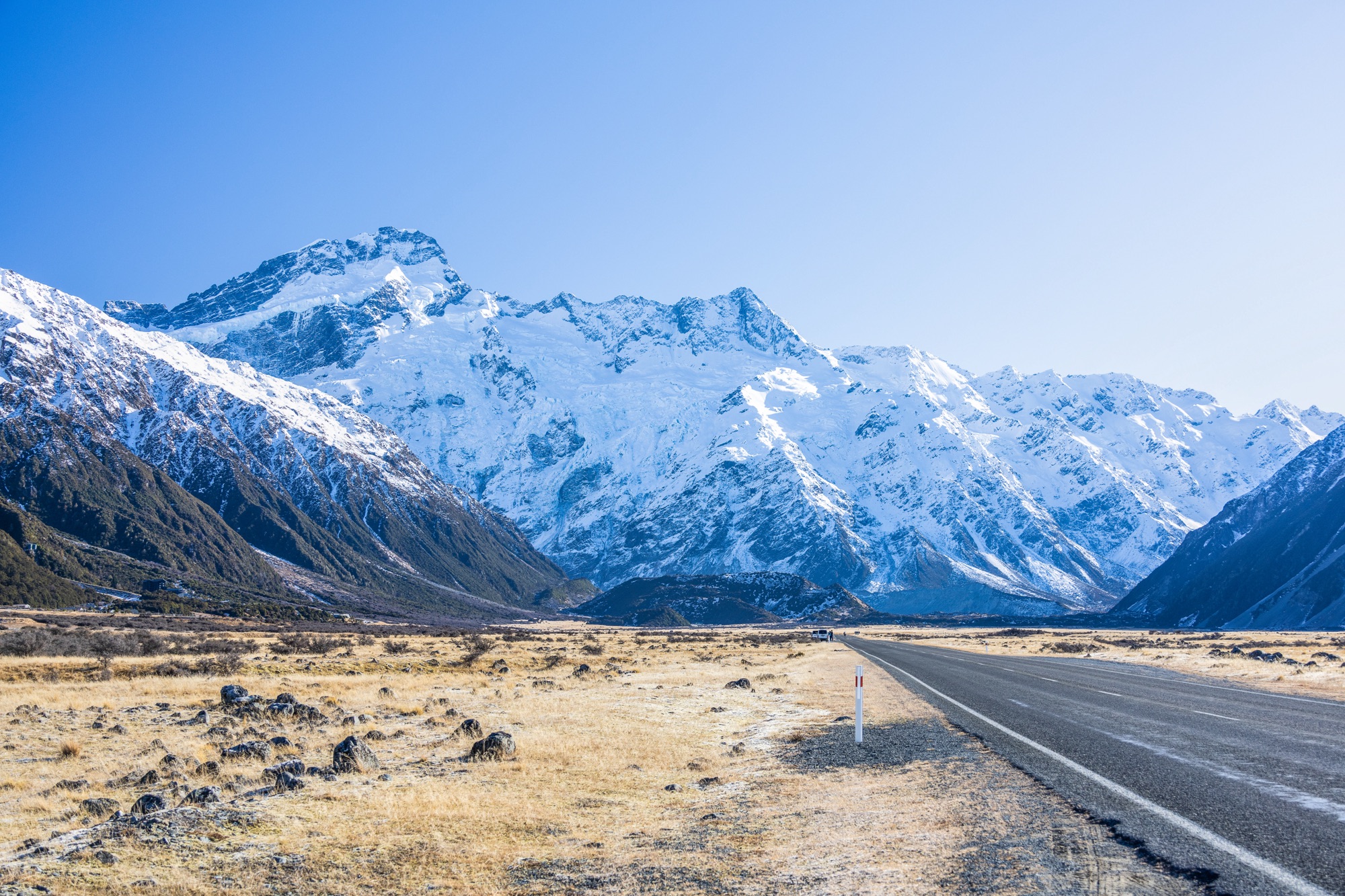 Reenergizados, continuamos nosso périplo em direção ao Mount Cook, o ponto mais alto do país, com 3.724 metros. No caminho, enfrentamos uma densa neblina, que mais parecia cena de um fime de terror. Qual não foi nossa surpresa quando a forte cerração se abriu como num portal e, ao fundo, surgiu a pequena montanha. Hollywood mandou um abraço.