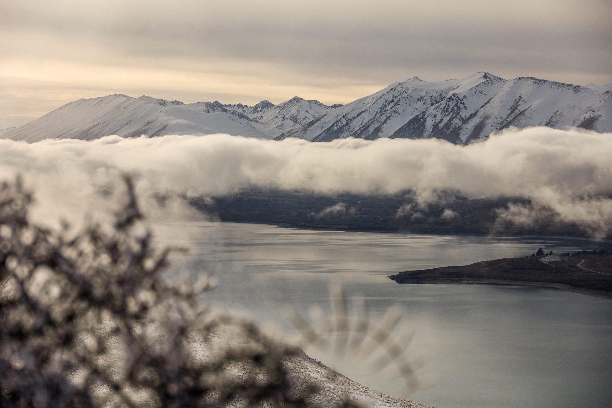 Passamos a noite próximo ao lago Tekapo e, na manhã seguinte, visitamos o observatório do Mount John. Enfrentamos o mesmo problema de dois dias antes lá no topo, quando ficamos diante de uma forte neblina. Como quem acredita sempre alcança, o tempo se abriu e pudemos ver a paisagem por alguns instantes. O café no observatório é bem charmosinho e sabe aproveitar a temática dos astros para decorar o ambiente e as bebidas.