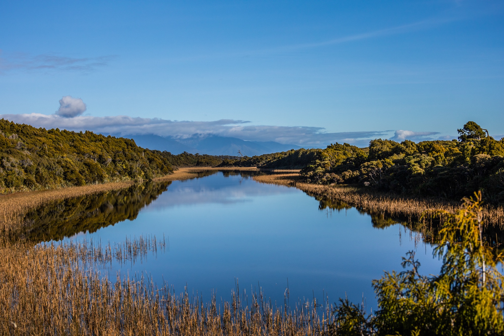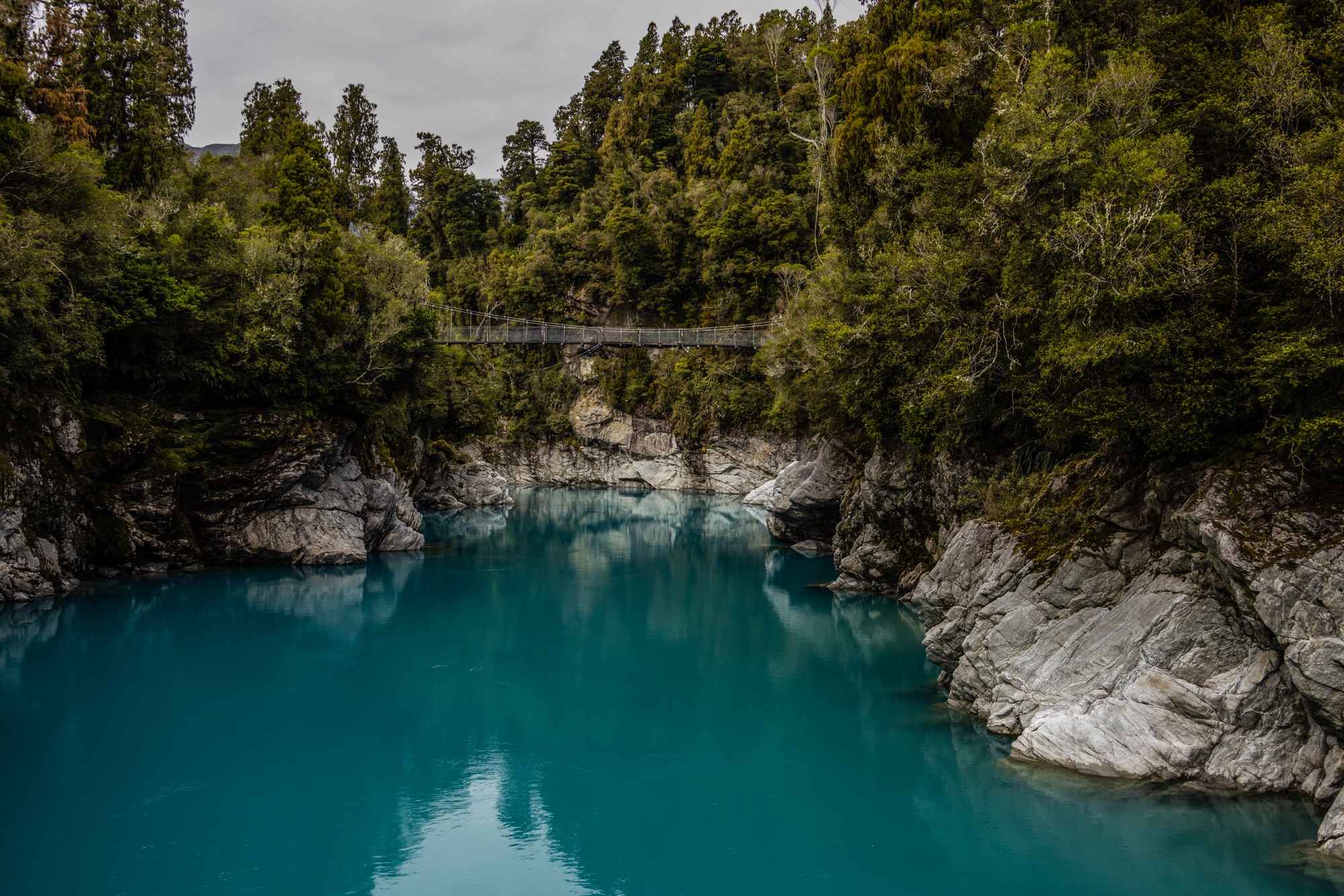 Lá perto, porém, fica a exuberante Hokitika Gorge. Em uma trilha fácil de pouco mais de uma hora, vimos de diferentes ângulos o rio de azul turquesa rodeado por rochas e muito verde.