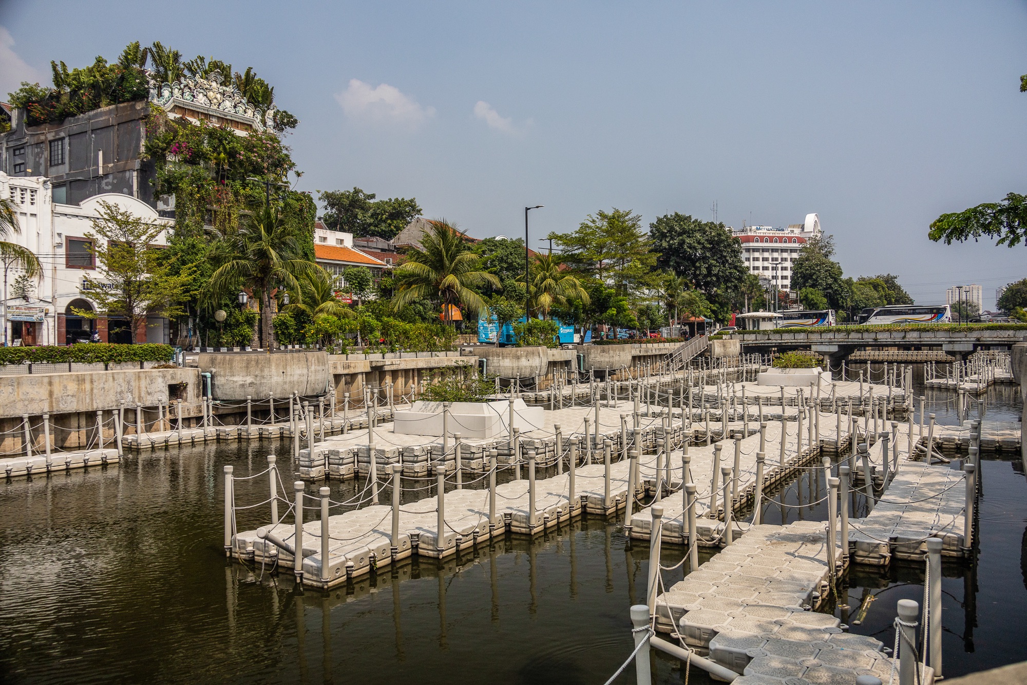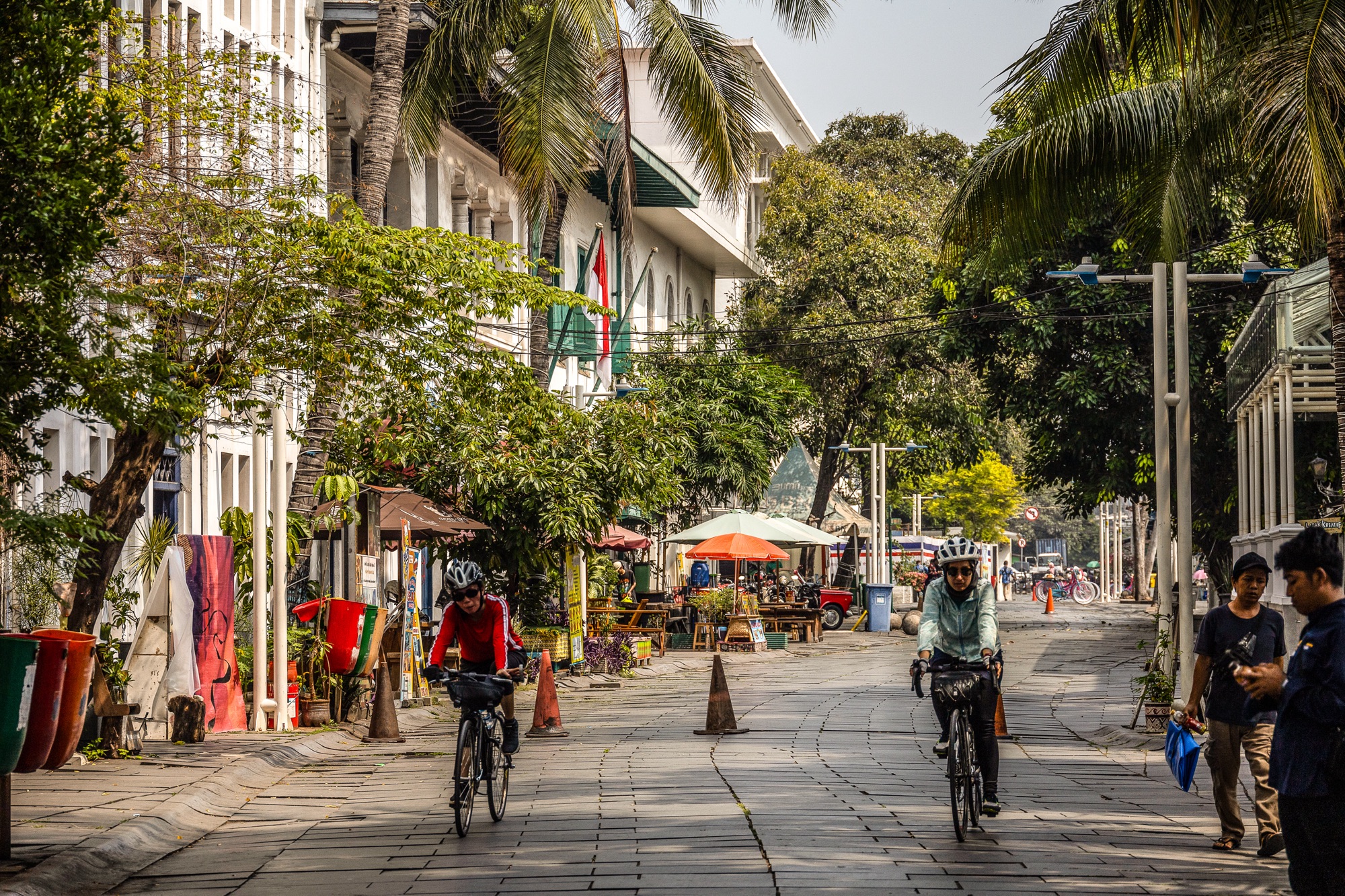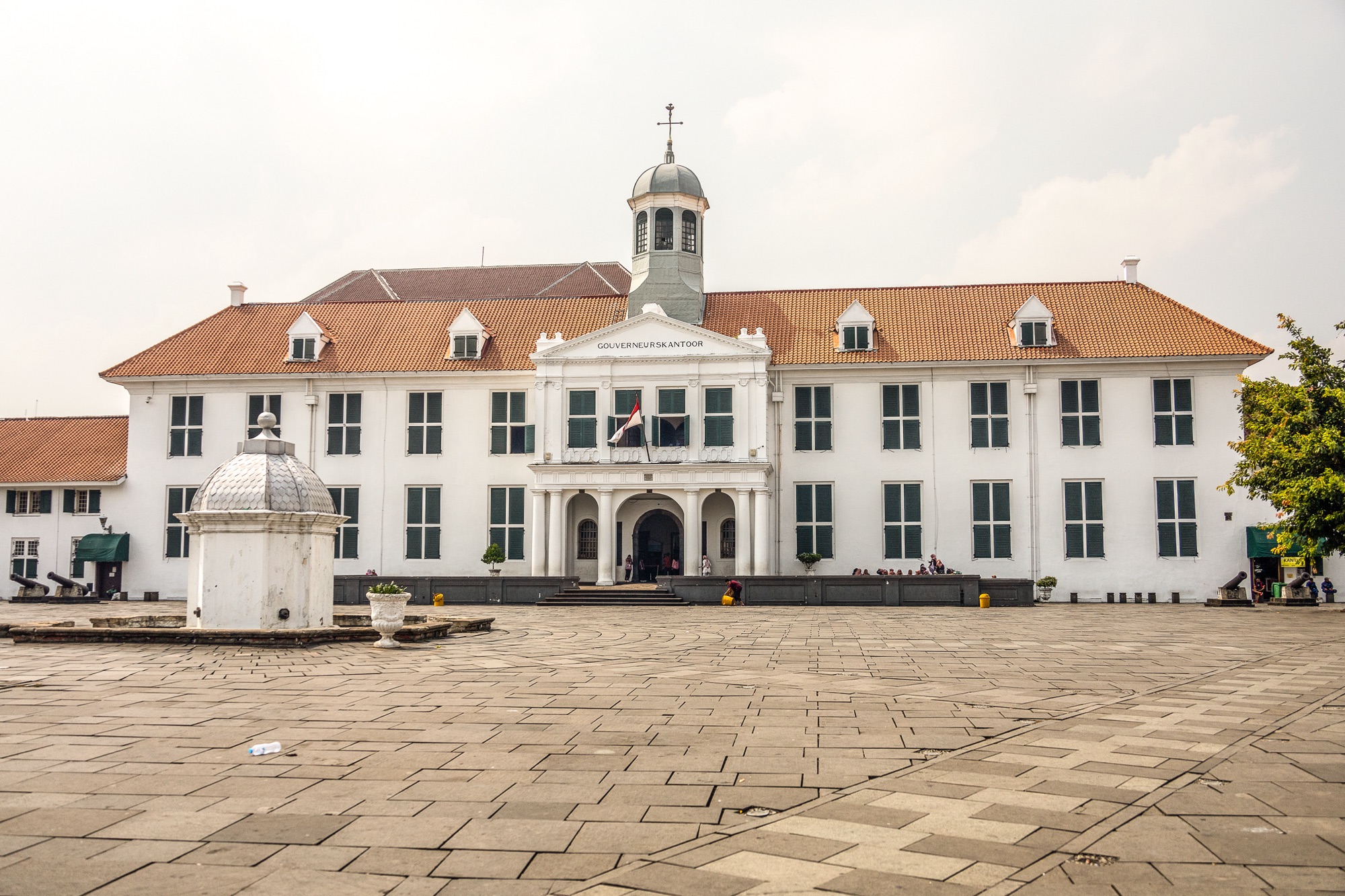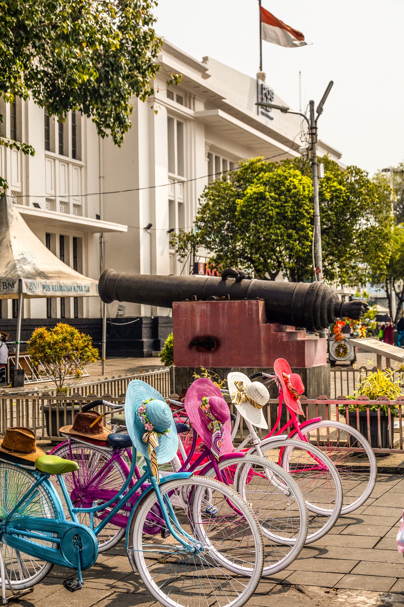 Em outro dia de muito calor, visitamos o centro histórico de Jacarta, conhecido por Kota Tua Jakarta. A área abriga alguns prédios que remetem ao período colonial, assim como um grande calçadão, sem árvores. Enquanto andávamos por lá, vimos um grupo guiado, o que pode trazer mais informações sobre a região.