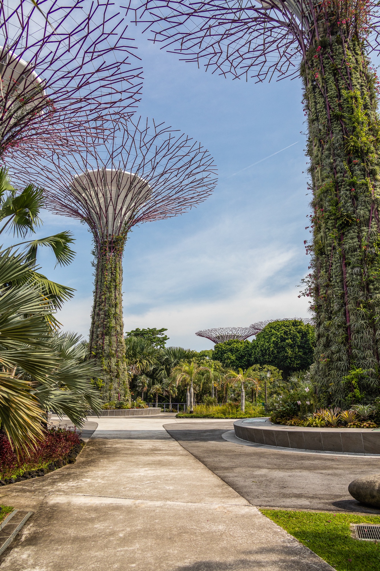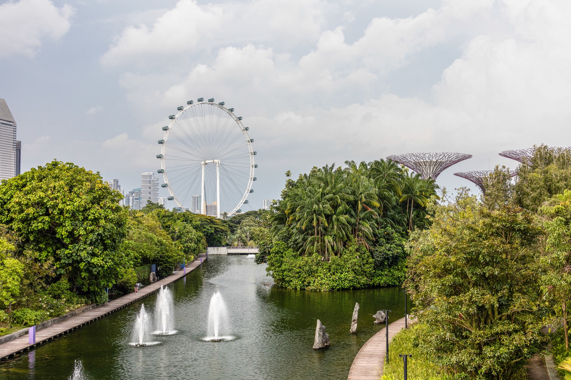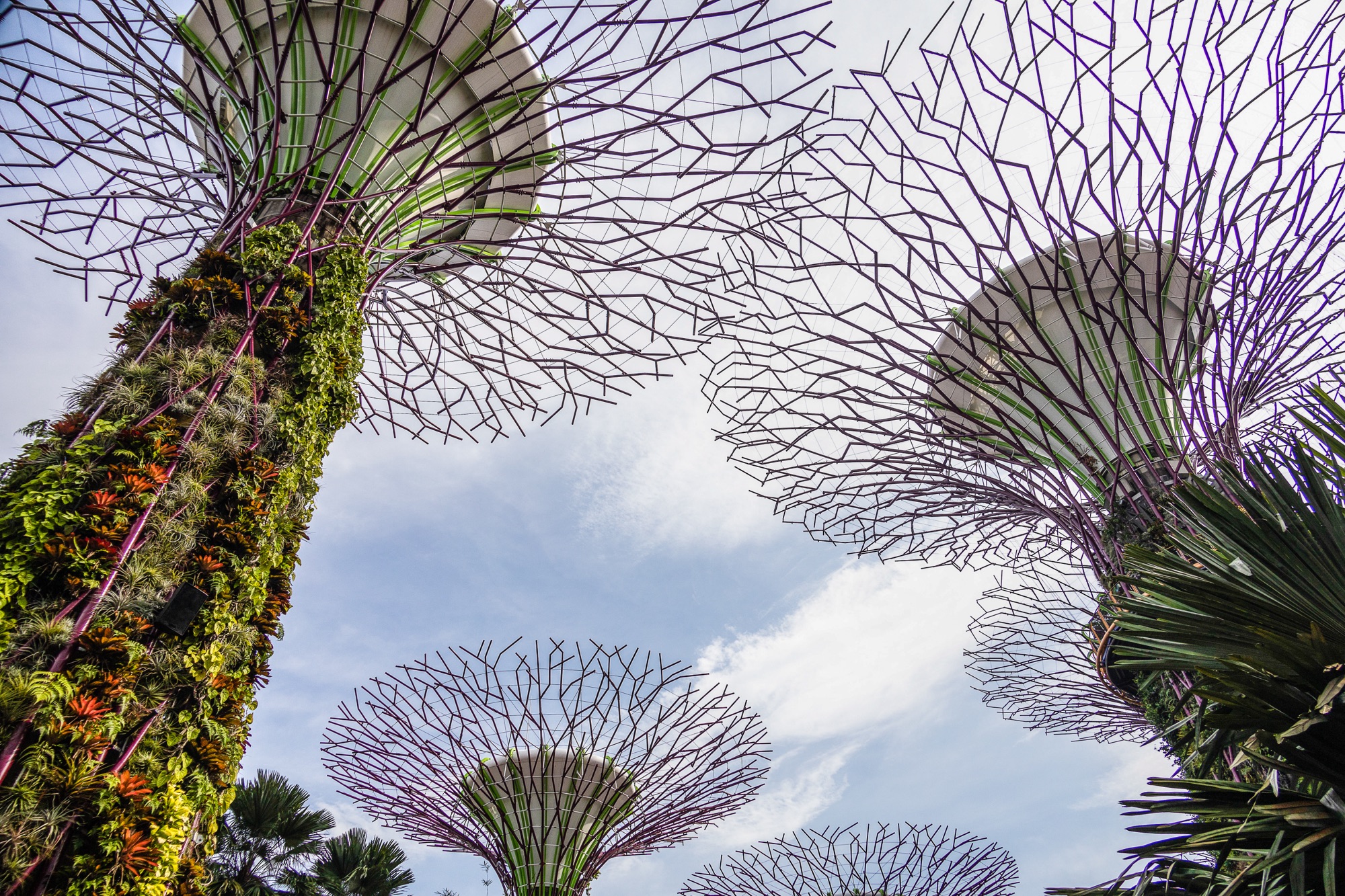Para alcançar outros marcos da região, é preciso caminhar a céu aberto. Como o calor estava forte, abrimos mão de visitar o Singapore Flyer, uma roda-gigante que lembra o London Eye, na capital do Reino Unido, e fomos diretamente aos Jardins da Baía (Gardens by the Bay). Lá estão as icônicas estruturas que remetem a árvores gigantes, as Supertrees, que coletam água da chuva e geram energia solar. É possível subir a uma plataforma suspensa e caminhar entre o topo de algumas dessas construções, por S$ 14 (R$ 60).